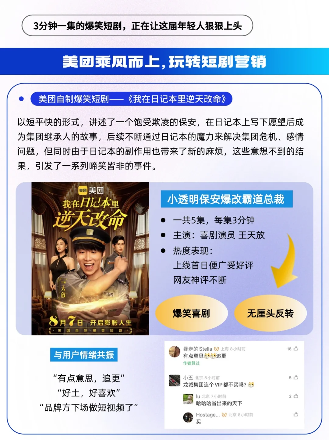 为寻找与年轻人对话的新路径,美团凭敏锐的嗅觉乘风而上,玩转短剧营销,自制爆笑短剧《我在日记本里逆天改命》,8月7日一经上线便爆笑出圈,硬控网友15分钟🤣