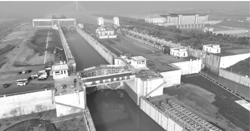 值得一提的是,蜀山复线船闸在技术创新上不止于“克难”,更着眼于“绿色”。蜀山复线船闸与已经投用的一线船闸平行布局,两闸中心间距102米。项目在两座船闸间增设了连通廊道,建成了我省首个具备“双闸互灌互泄”功能的省水船闸系统。