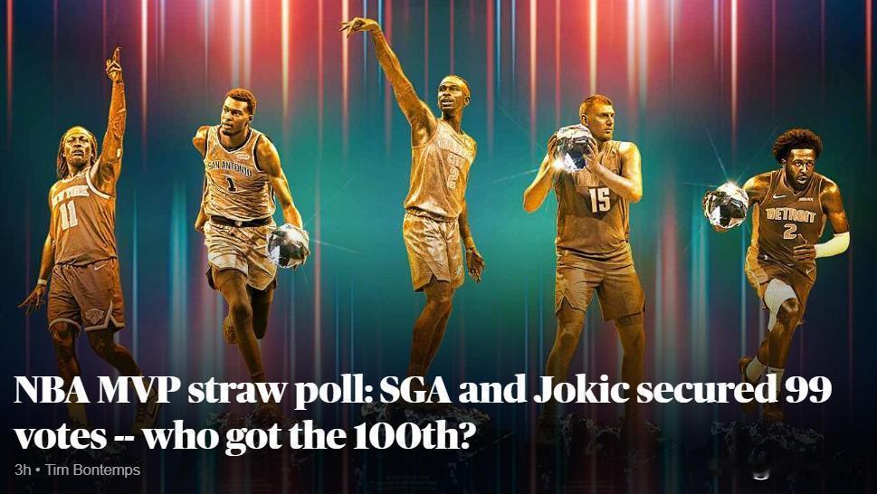 NBA赛季来到三分之一的节点,于是ESPN的蒂姆·邦坦普斯又启动了自己年复一年的工作:MVP模拟投票。还是按照老规矩,在全美找100位记者来模拟真实投票阵容,在赛季之中找几个时间节点来进行当下的模拟投票。 本赛季的第一次模拟投票结果现已公布,在总计100张选票中,亚历山大和约基奇拿走了其中99张第一顺位票,剩下的唯一一票归属卢卡·东契奇。以赛季迄今球队战绩和个人发挥而言,亚历山大和约基奇将投票再次变成二人转显然在情理之中,本次投票亚历山大拿下57张第一顺位,约基奇42张,因此亚历山大总分以微弱优势占先。 比较有趣的是,所有100票中,约基奇有99票在前二顺位,而亚历山大则是98票,也有少量记者没有将他们放进前二,当然这些散票基本可以视作离群数据,不影响整个调查的结论。而在剩下2/3个赛季里,其他球员要成为搅局者,说实话难度极大。哪怕坎宁安领着活塞冲到东部第一,但个人能力、比赛稳定性、高阶数据上都和两人有差距——那么拿到剩余仅有那张第一选票的卢卡,几乎是能杀进战团的唯一人选,但以东契奇之强,基础数据之华丽,却仍在各方面都处于落后。 所以还是那句话,在大概率的剧情里:无论是约基奇6年4MVP,还是亚历山大连续两年冲大满贯,我们其实都在见证夸张的历史正在发生。