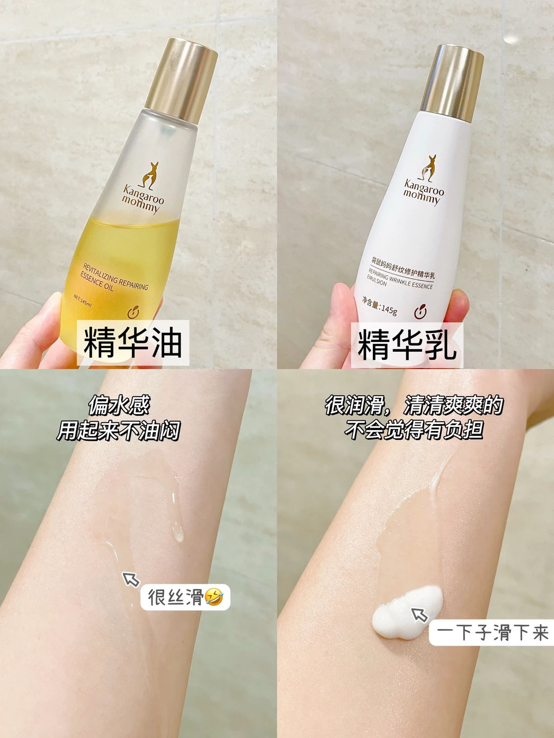🔹精华油可以增加皮肤弹性,精华乳富含多肽精华,有助于紧致肌肤和加强保湿,✔️先油后乳,搭配正确的按摩手法早晚坚持涂,吸收后,你会觉得皮肤水水润润的不紧绷,很舒服!一点都不会觉得厚重和闷