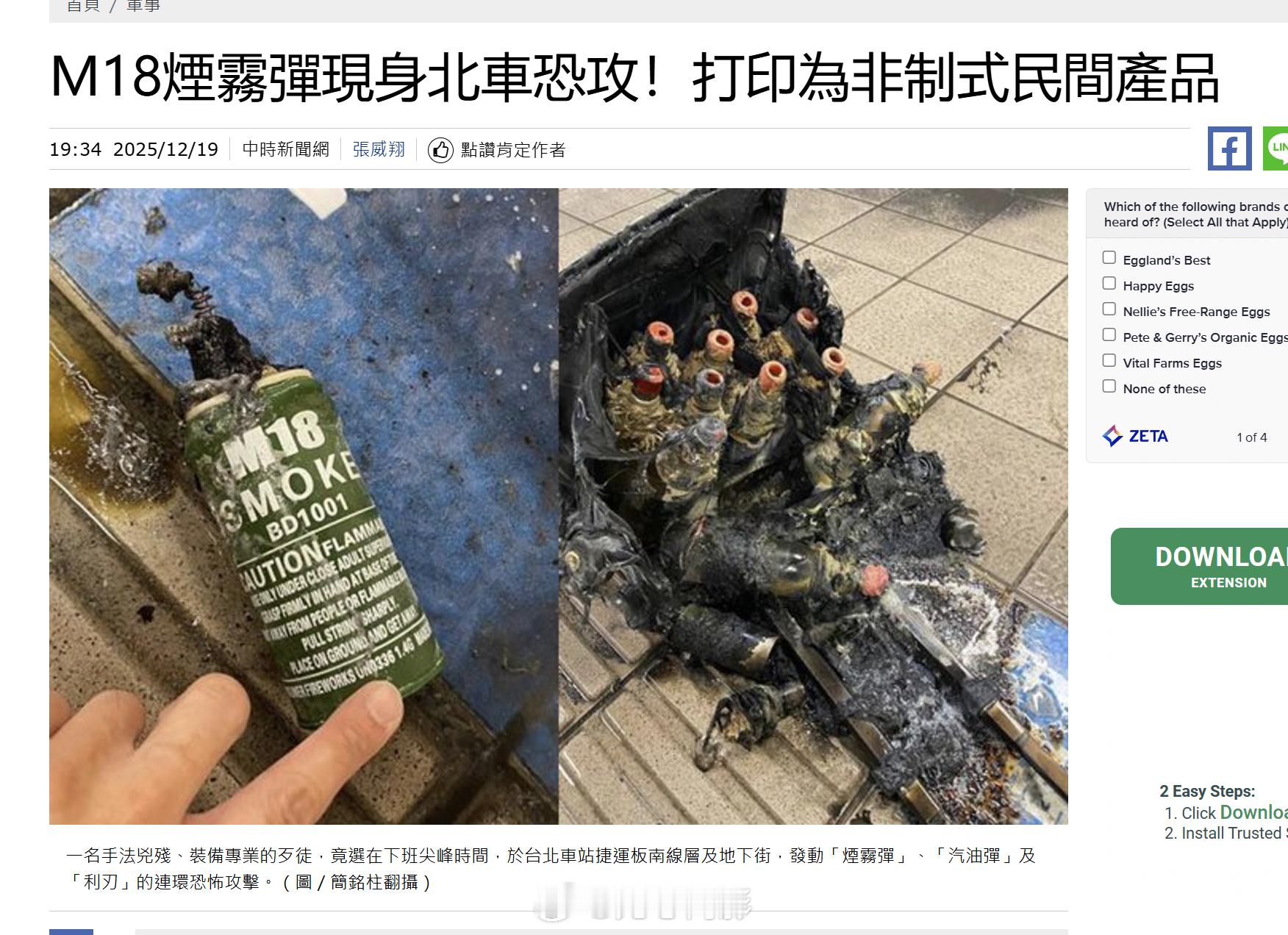 台北车站袭击案已致9伤4危 目前传出的消息称,嫌犯丢的烟雾弹型似为M18烟雾弹,但上面的打印的字样与制式版本有明显差异、发烟量也略少于制式M18烟雾弹,应为民间休闲、训练用的产品。M18烟雾弹是美军与多国军队广泛使用的一款制式烟雾手榴弹,主要用途并非杀伤,而是透过大量烟雾来遮蔽视线、标示位置或传递战场讯号,在现代军事行动中属于高度实用的辅助装备。