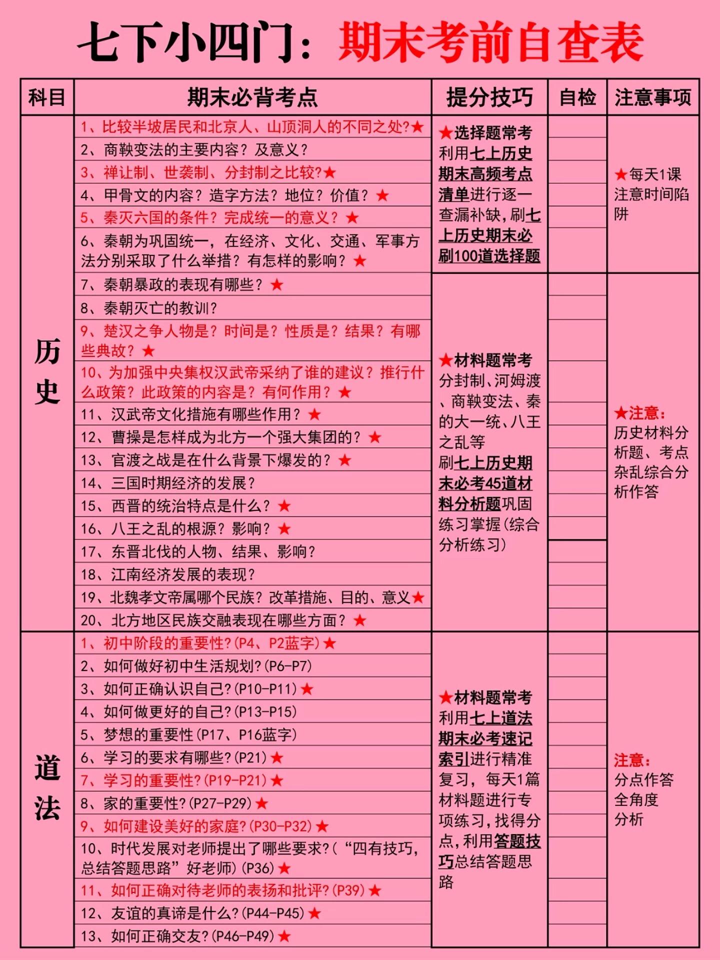 七年级上册期末考前自查表知识点复习汇总。七年级上册上册期末考试必背知识点复习,老师给大家整理出来。家长可以直接打印出来学习,期末考试必考重点!