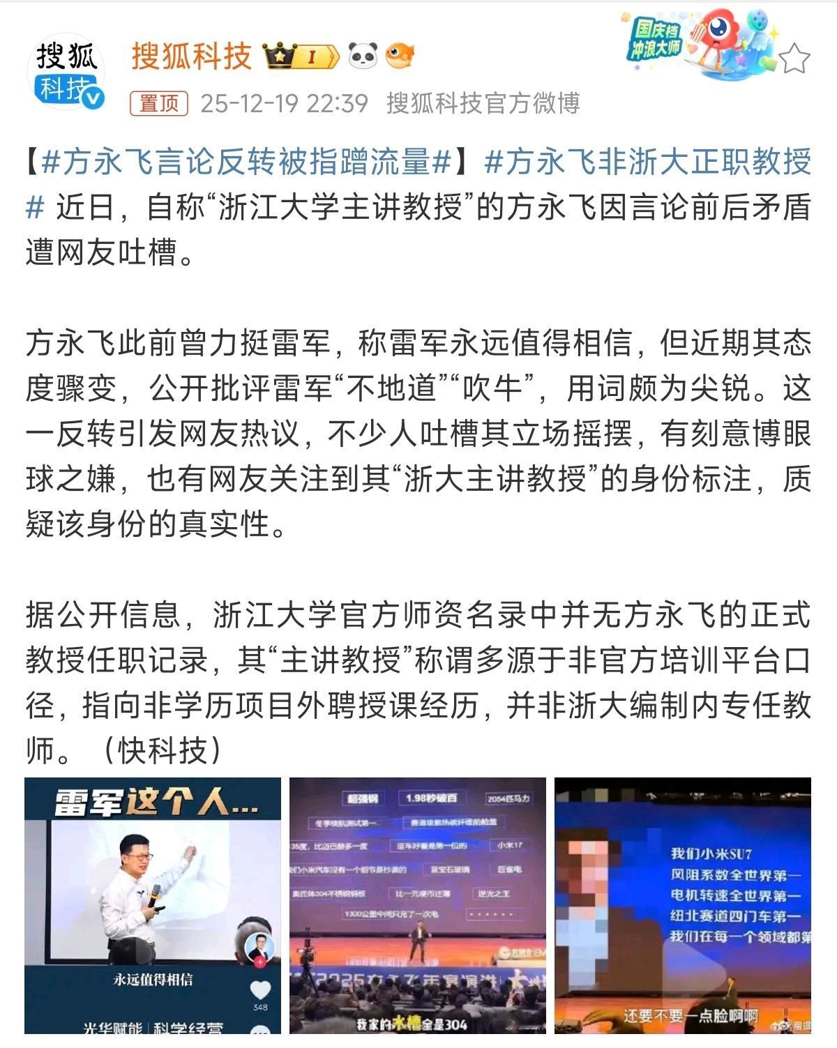 方永飞言论反转被指蹭流量方永飞这人的“浙江大学主讲教授”的身份,被扒出浙大官方师