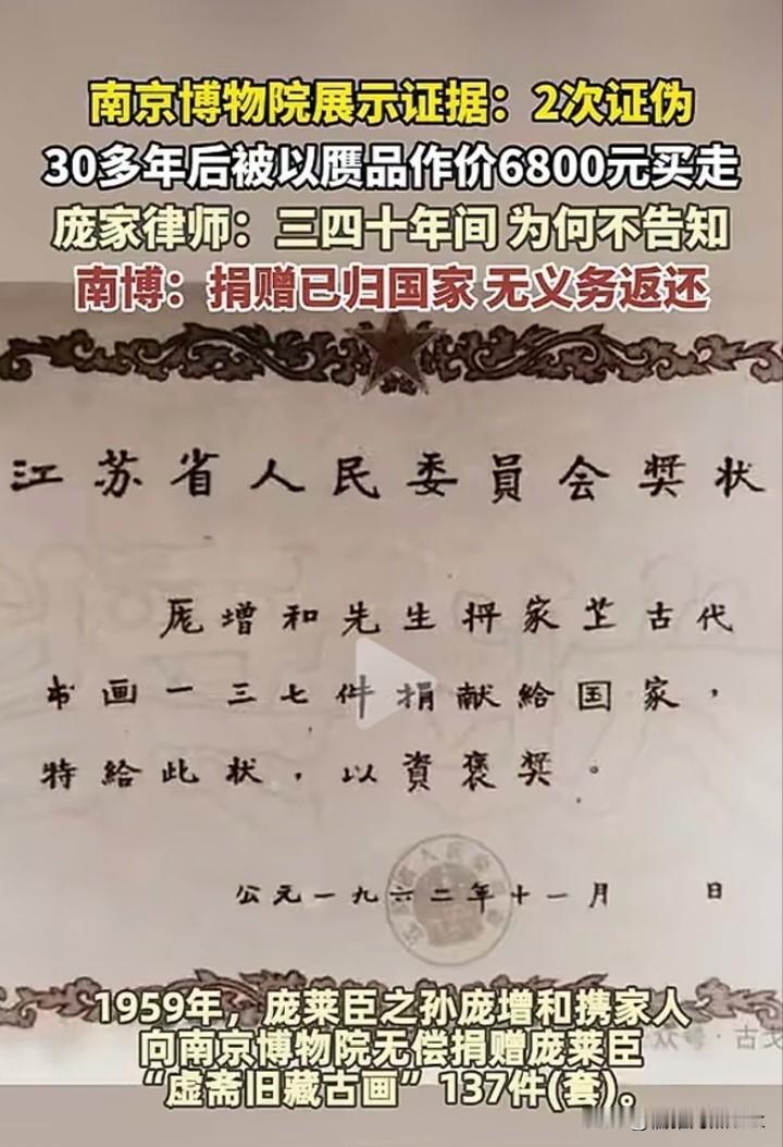 庞家捐赠藏品不仅一直没被尊重,窝囊气倒受了不少,与南博几十年的官司也致妻子心力交瘁去世。 1959年,庞莱臣的长孙庞增和携家人向南京博物馆无偿捐赠了137卷(套)字画,含明代仇英《江南春》图卷,南博出具了捐赠收据及清册等捐赠证明,江苏省还开了颁奖大会,南博院长曾昭燏亲笔提写的奖状。 1963年,南博继续对庞增和进行动员,以征集作品的名义,庞增和再次决定,将部分虚斋旧藏古画征集给南博,除宋徽宗《鸲鹆图》出价1万元外,其余均以象征性价格交易。 1963年,南博工作人员徐沄湫以办画展为由,向庞增和借吴镇《松泉图》轴与吴历《仿古山水册页》,称展期三个月后归还。 1964年南博院长曾昭燏自杀,庞增和虽然很着急这两幅画的归属,但也不好在这个节骨眼上去向南博讨,就这样,徐沄湫也没提还。 1979年至1988年,庞增和夫妻俩多次前往南博讨要此前借出的两幅画,南博拒不归还。 1988年,庞增和向法院起诉确认两幅画的所有权,因无借条佐证,法院最终判为南博征购,需向庞家支付5.4万元画款。 2014年12月26日,南博策划的“藏天下:庞莱臣虚斋名画合壁展”开幕,庞家后人因展览相关文章中,“庞莱臣子孙败落到卖画为生”表迖,起诉南博及文章作者侵犯名誉权,庞家胜诉。 南博不服气,为了证明庞家“卖画”,拿出了明代仇英《江南春》图卷被南京艺兰斋收藏的证据,庞叔令起了疑心,明明是自家捐给南博的画,何以成为对方指控自己“卖画”的证据,还流向了外面。 2016年开始,庞家持续向南博写信,请求查看1959年捐赠的137幅字画的现状,未收到任何回复。 2022年11月,庞叔令的母亲在与亲友谈及与南博的纠纷时,情绪激动突发心脏病去世。 2024年10月10日,庞叔令起诉南博,要求其履行捐赠文物告知义务。法院出具民事调解书,约定南博在2025年6月30日前,安排其查验藏品。 2025年下旬,1959年捐赠的《江南春》画卷出现在北京某拍卖公司的图录上,起拍价8800万元,庞叔令举报,拍卖公司撤拍。 2025年6月,庞叔令在查验藏品时,发现137幅字画中少了5幅,《江南春》正在其中。 2025年7月,南博书面回复,5件缺失的字画是“伪作”,被剔除藏品序列,并做划拨,调剂处理了,但未说明具体去向。 2025年11月20日,庞叔令状告南博案件开庭,要求知晓5幅画作的去向并要求返还。 2025年12月17日,南博回应,捐赠已归国家,无义务返还,九十年代处置过该5幅画。 该事引起全社会关注,江苏省文旅厅工作人员称,已成立专案组调查。 庞莱臣是全国数一数二的收藏家,庞家所捐的藏品在近代的捐赠史上位居前列,真伪毋庸置疑,但也可以说是最受窝气的捐赠者,完全看不到南博对庞家的尊重。 如果不是当年留有捐赠凭证,估计都不得承认有捐赠一事。 庞家在那个特殊年代,捐赠或许保了平安,同时也被别有用心的人惦记上了,南博从高兴的接受捐赠,到强借不还,再到翻脸,以为庞家就此没落,谁也没想到庞莱臣的孙辈很有骨气,一直在追问结果。 南博的公信力已降至冰点,也让整个博物馆界的声誉大打折扣,这次如果处理不好,会造成更多的宝贝流失,唯有以对捐赠者,对国家负责的态度,公平公正公开的处理,才能挽回声誉。