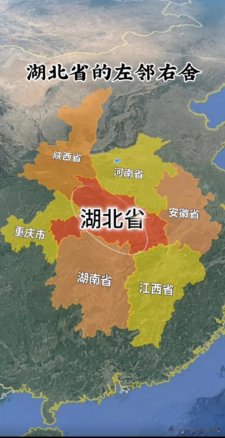 湖北省的邻居有哪些呢?下面图片可以告诉你,湖北省的邻居有陕西省,河南省,安徽省,江西省,湖南省,重庆市,湖北处于这些省直辖市的中心区域,从湖北出发去这些省直辖市都比较便捷,可见湖北省地理位置还是非常不错的。