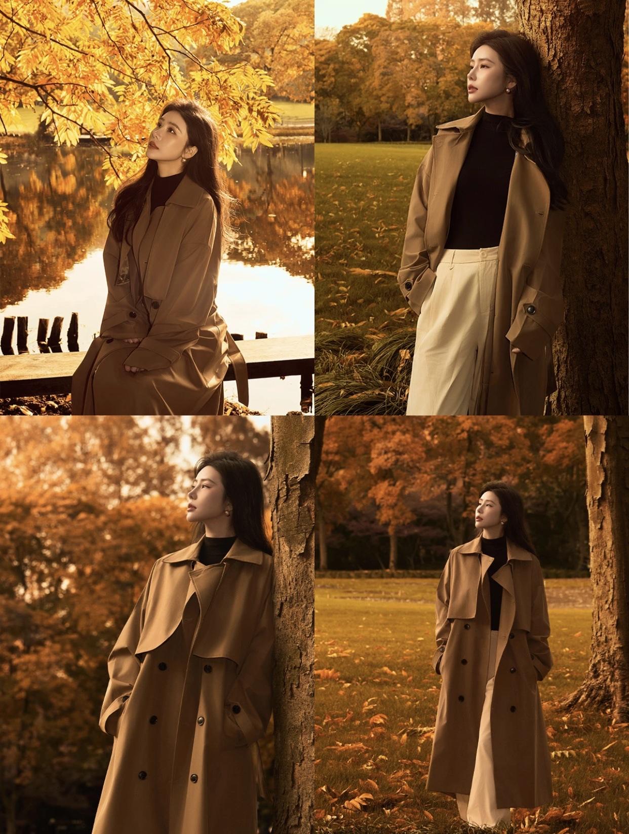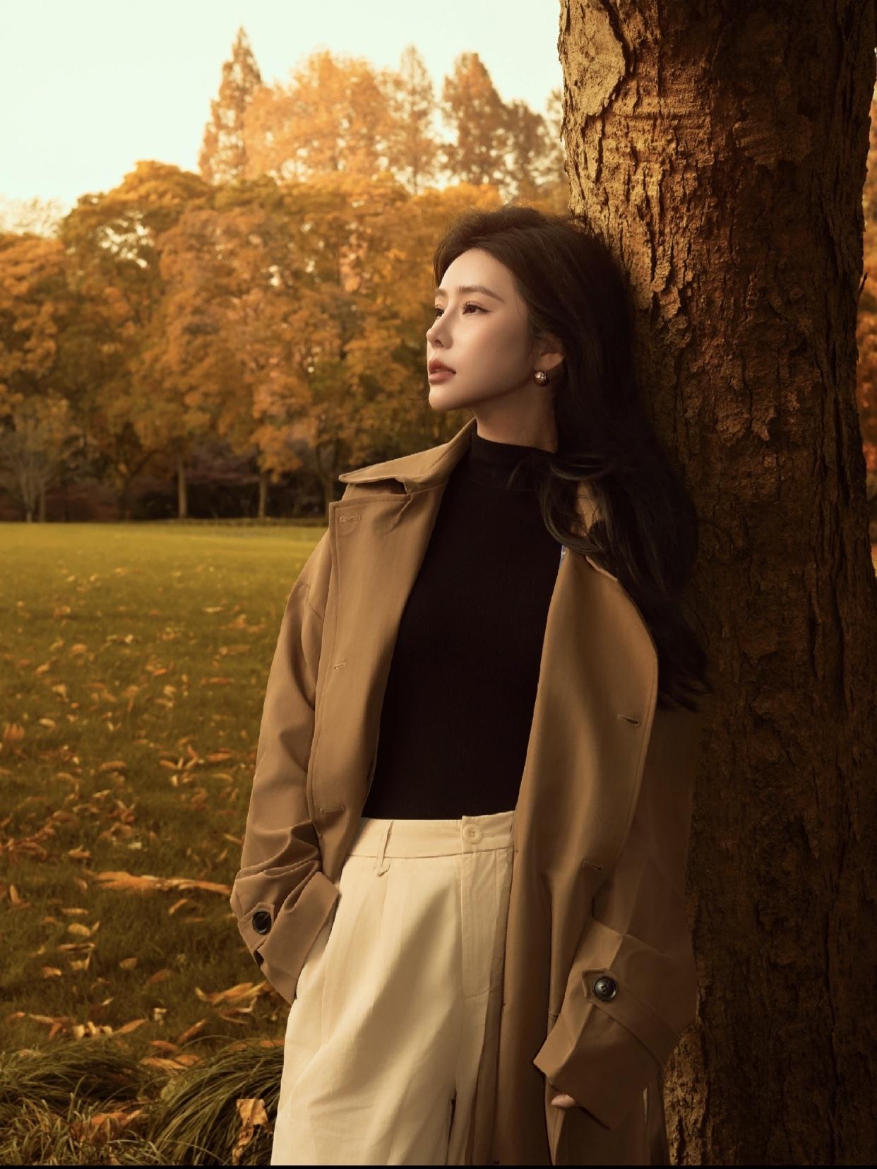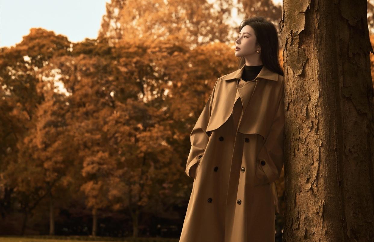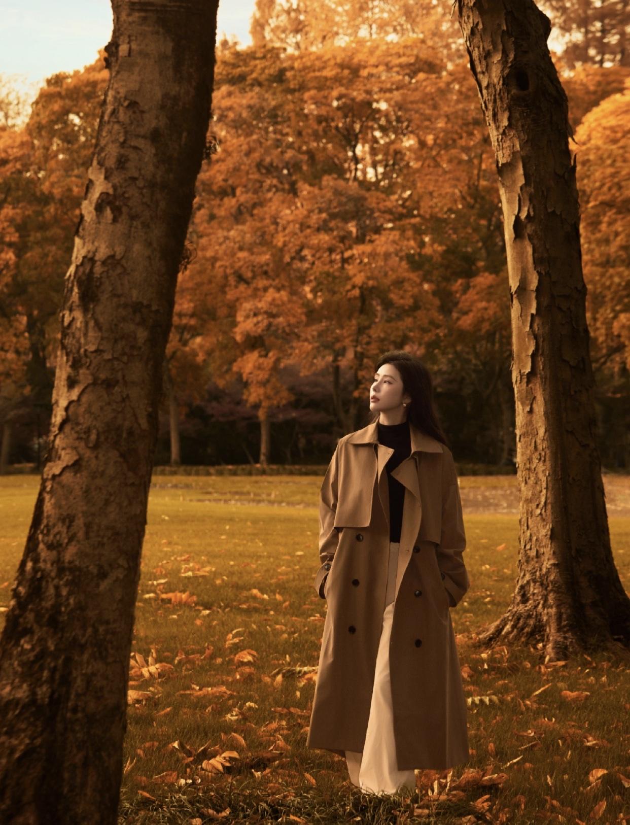 女孩子怎么穿搭既时尚又好看?秋日暖阳下,优雅的白色大衣,与橙黄的树叶相映成趣。