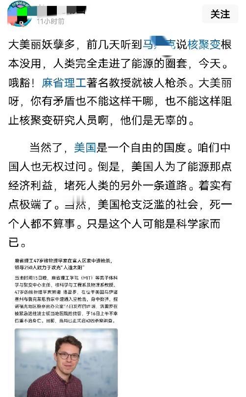 美国的核聚变首席科学家被枪杀了,这个麻省理工大学的物理学家,带领一个几百人的科学家团队在攻克核聚变技术,俗称人造太阳。 这事儿听着就透着邪乎,根本不是什么随机的刑事案件。能让一个顶尖科学家招来杀身之祸,背后肯定牵扯着天大的利益纠葛,说白了就是有人觉得他挡了自己的财路,所以才下了狠手。 这技术要是真搞成了,人类就能用上几乎无限的廉价能源,到时候电费可能便宜到让人不敢信。不管是大型工厂、数据中心,还是日常家庭用电,都不用再为电费发愁,整个社会的运行成本都会大幅降低。 更关键的是,这也是现在中美之间竞争最激烈的科技项目之一,谁先把核聚变技术商业化,谁就能在未来的全球能源格局里掌握主动权,甚至能改写全球的经济规则。 可就是这么个能造福人类的技术,却把两类人的饭碗直接架到了火上。一类是老派的化石能源巨头,那些靠石油、煤炭、天然气赚钱的大公司,要是核聚变普及了,他们手里的资源就会变得一文不值,万亿级的市场说砸就砸。 这些巨头在全球范围内都有着盘根错节的势力,为了保住自己的利益,什么手段都使得出来。 另一类就是新派的新能源资本,比如搞光伏发电、风能、太阳能的那些人,他们砸了海量的钱建电站、铺产业链,满心期待着靠新能源垄断未来的能源市场。 可核聚变一出来,他们的这些投资基本上就成了废品,之前的投入全打了水漂,怎么可能不着急。 前几天那个叫马圣才的,就是美国新能源圈的头面人物,手里攥着大把的光伏产业资产,他公开说核聚变是个圈套。这话听着是质疑技术,实际上就是急了眼,怕核聚变成了气候,自己的光伏生意全完了。 他这话刚说完没几天,这边麻省理工的这位首席科学家就被人枪杀了,这时间点也太巧合了,巧合到让人没法不联想。 很难不让人觉得,马圣才的言论要么是给某些势力递了话,要么就是提前预判了接下来要发生的事,毕竟核聚变技术每往前推进一步,对他们这些新能源资本来说,就是多一分威胁。 这位科学家可不是孤军奋战,他带着几百人的团队在攻坚,能走到这一步,肯定已经取得了不少关键突破,甚至可能已经摸到了商业化的门槛。 也正是因为这样,他才成了某些人的眼中钉、肉中刺。在那些资本眼里,什么科学进步、人类福祉,都比不上真金白银重要。 只要有人挡了他们的财路,不管你是顶尖科学家还是行业大佬,都会被他们视为必须清除的障碍。 至于美国警察后续的调查结果,不用等都能猜个八九不离十。大概率又是那套老说辞,什么“自杀”,搞不好还会编出个“后背开八枪自杀”的离谱结论。 美国警察那套调查套路大家也都熟,碰到这种涉及资本巨头利益的案子,要么查不出结果,要么就往“自杀”“个人恩怨”上靠,反正就是不敢碰背后的大资本。 毕竟这些能源巨头和资本势力,早就把触角伸到了美国的政治、司法系统里,想让警察查出真相,简直是天方夜谭。 这事儿也彻底暴露了美国资本的真面目,在利益面前,所谓的民主、自由、科学精神全都是摆设。 他们嘴上喊着推动科技进步,可真到了有技术能打破现有利益格局的时候,就会立刻露出獠牙,用最野蛮、最血腥的手段来维护自己的垄断地位。 之前也不是没有类似的事儿,一些可能会颠覆现有产业的技术开发者,要么离奇失踪,要么遭遇意外,背后全是资本在作祟。 这位麻省理工的科学家,本来可能带领人类走向能源新时代,最后却成了资本利益斗争的牺牲品,想想都让人唏嘘。 他的死也给所有人提了个醒,在资本主导的规则里,所谓的公平正义、科学进步,都得给利益让路。那些能源巨头和新能源资本为了保住自己的利益,已经到了不择手段的地步。 现在全球都在盯着核聚变技术,中美两国的竞争也进入了关键阶段。可美国这边却出了这样的事儿,很难说不会影响他们的核聚变研究进程。 毕竟不是谁都有勇气顶着资本的压力搞科研,万一后续团队里的其他科学家害怕了、退缩了,美国的核聚变项目很可能会陷入停滞。 而这,或许正是那些背后搞鬼的资本想看到的结果,只要能保住自己的利益,哪怕耽误整个国家的科技发展,他们也毫不在乎。 说到底,这起枪杀案根本不是什么简单的刑事案件,而是一场资本对科学的绞杀。这位科学家挡了别人的财路,所以才招来杀身之祸。后续不管美国警方怎么调查,怎么粉饰,都改变不了这个核心事实。 毕竟在那些能源巨头和资本眼里,除掉一个科学家,就能保住他们万亿级的利益版图,这笔账在他们看来太划算了。 只是不知道,这起事件之后,还有多少科学家敢顶着压力继续推进核聚变技术的研究,人类的能源革命会不会因为这些资本的阻挠而推迟。
