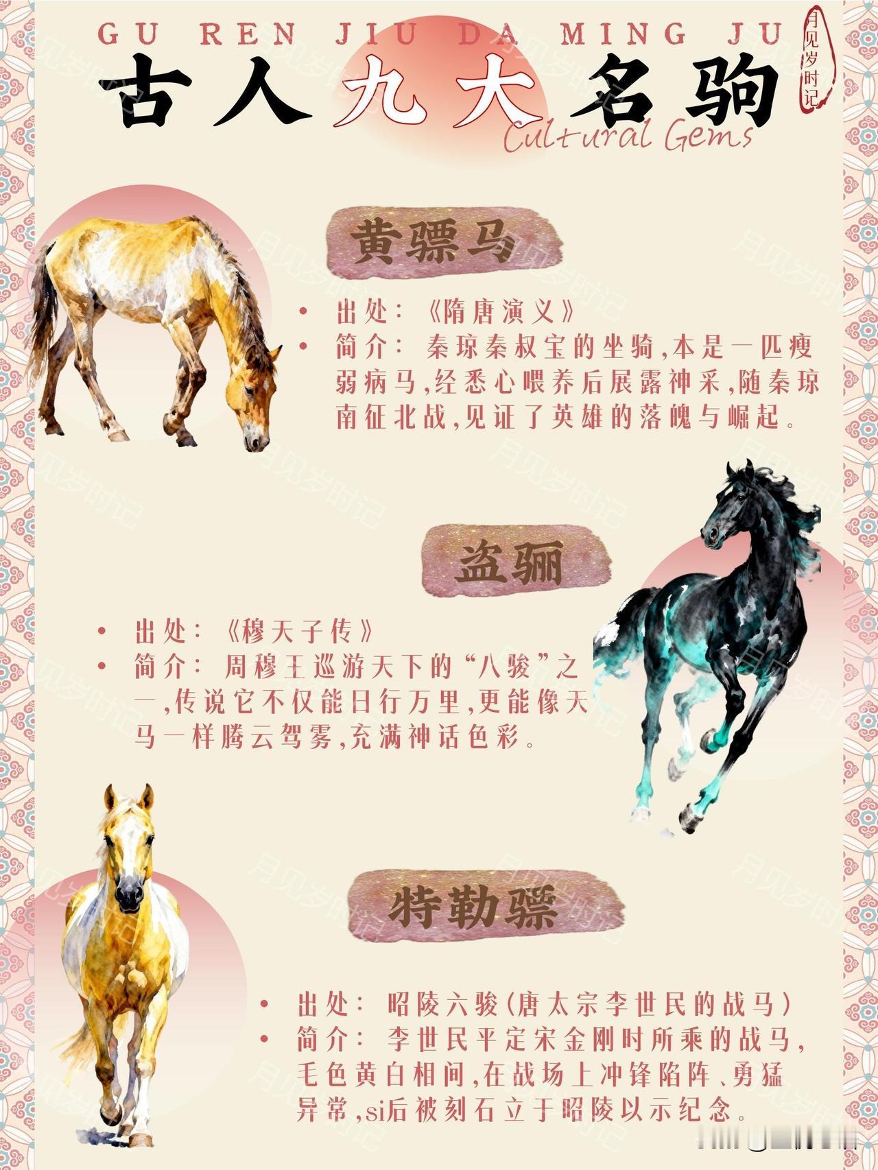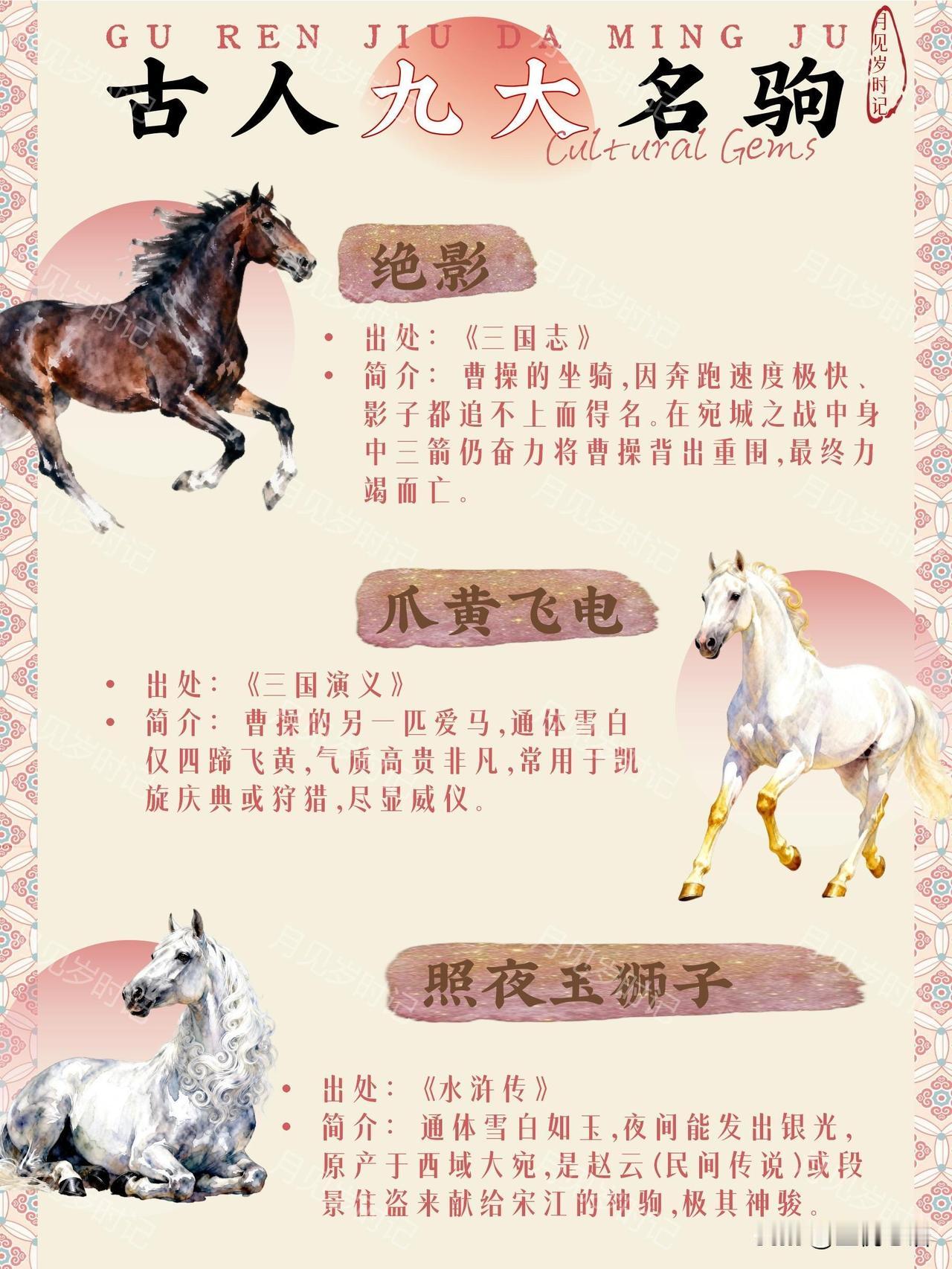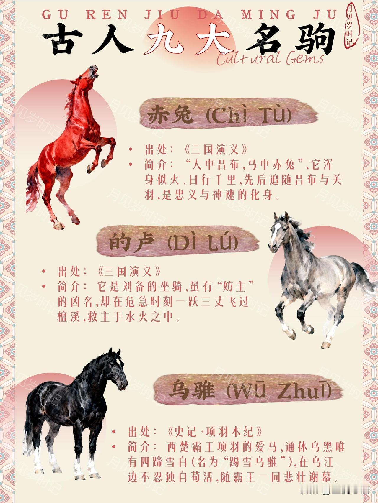马年必懂!聊聊古人九大传世名驹。 马年聊名驹,越聊越上头! 这九匹神驹简直把“忠义”“神速”焊在骨子里了~ 赤兔随吕布关羽,是忠义天花板; 的卢跃檀溪救刘备,凶名之下藏大义; 乌骓陪项羽赴死,悲壮到让人破防。 还有快到影子追不上的绝影, 高贵的爪黄飞电, 夜间发光的照夜玉狮子… 每一匹都藏着英雄故事! 比起现在的代步工具, 古人的马更像战友啊~ 新一年,谁不想沾沾这些名驹的“马力”, 冲劲满满、事事顺遂? 愿我们都有好“马”运,一路开挂!