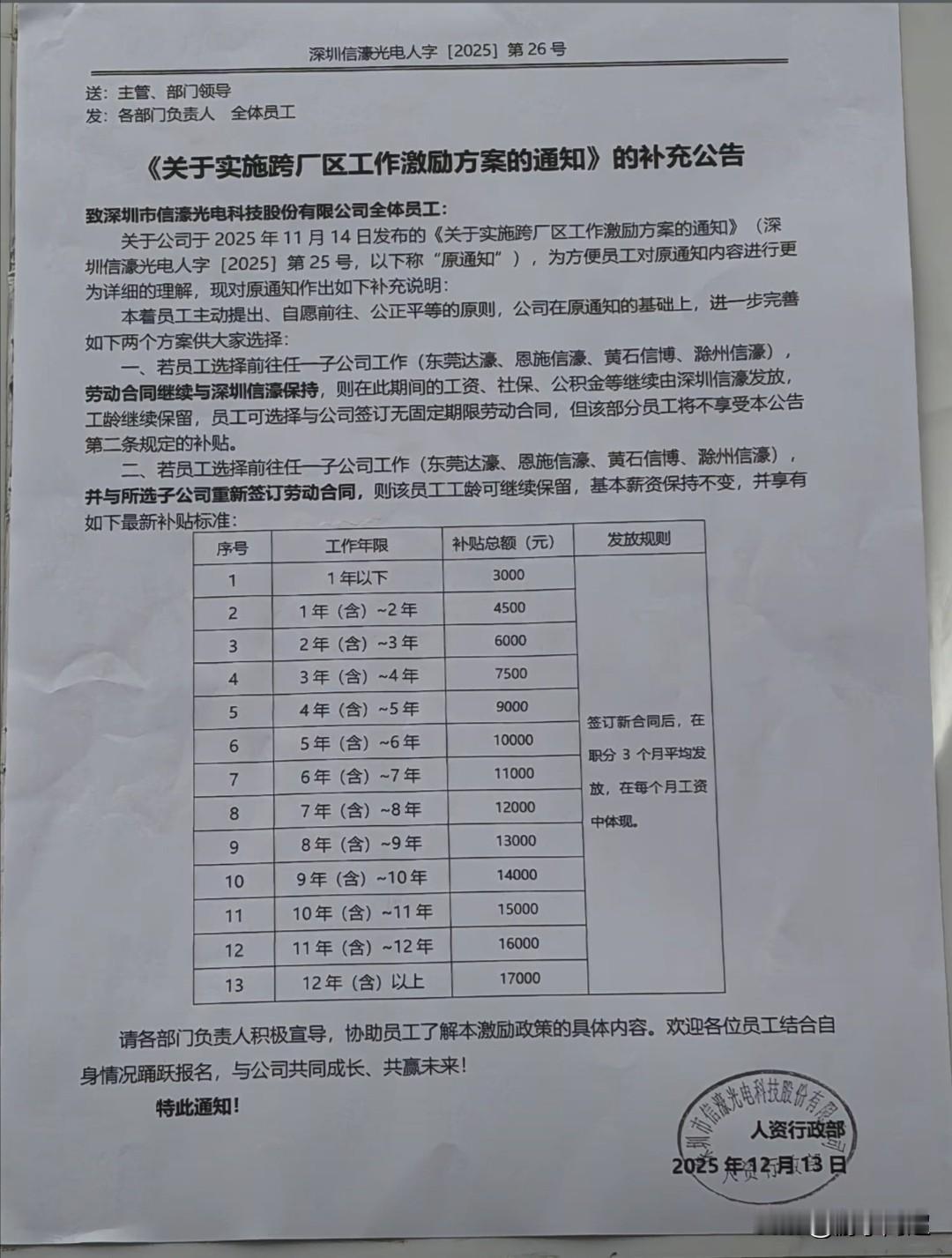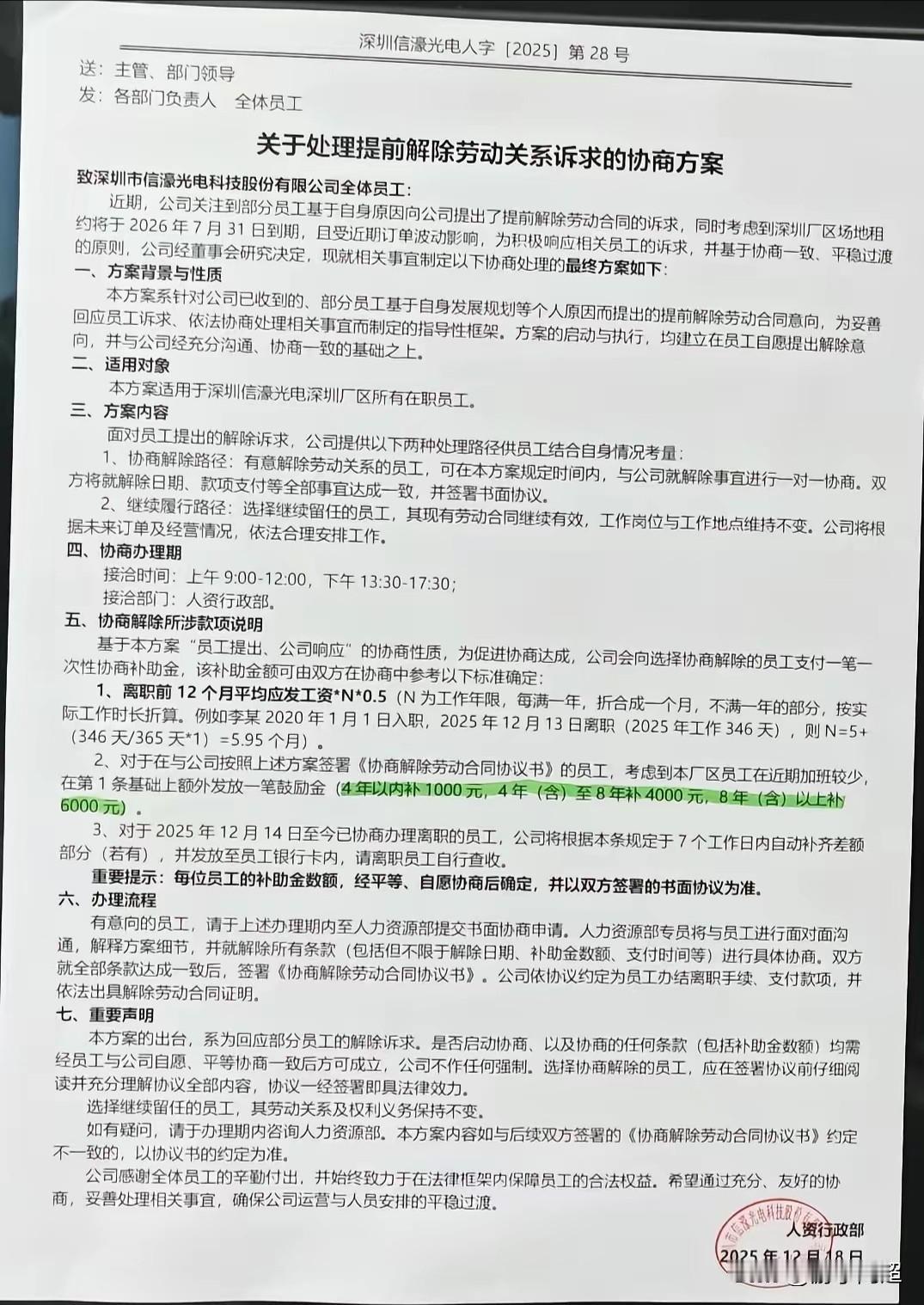近日,深圳信濠光电搬迁引发员工维权事件终于有了新进展。 深圳松岗信濠光电因生产经营发展需要,将搬迁至东莞市松山湖。这种跨市搬迁给部分员工后续上班带来不便,因此一些员工不愿前往,并向公司提出诉求。 公司也明白搬迁会对员工造成一定影响,便按年资给员工发放3000 - 17000元不等的经济补偿,但许多员工仍坚持不随公司搬迁。 双方进行了好几天的谈判协商。之后,公司又发布了一份关于与员工解除劳动合同关系诉求的协议书。 从协议内容来看,公司也确实拿出了一些诚意,一些……