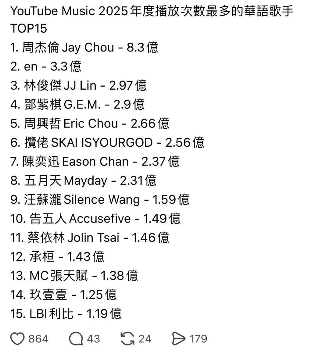YouTube Music2025年华语歌手TOP15,周杰伦断层领先!