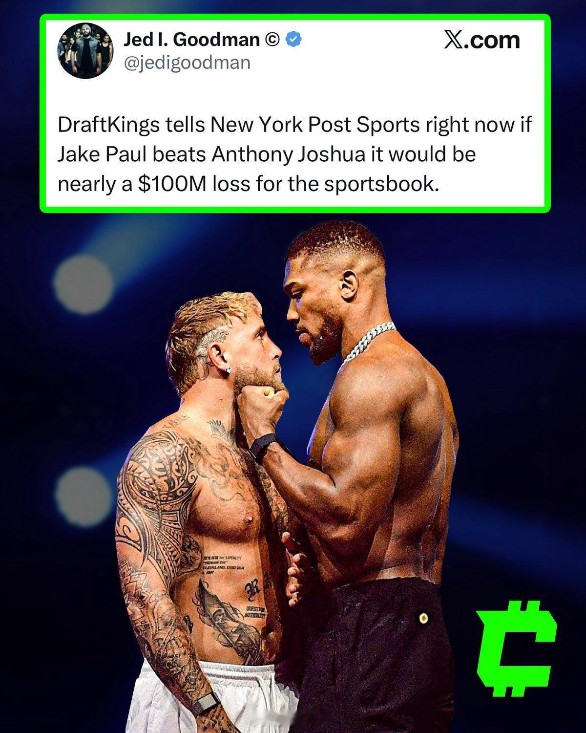 网红Jake Paul和拳王约书亚的比赛今天来战,盘口一直看好拳王(下1200才赢100,网红下100赢700),Draftkings说,如果网红取胜,他们平台损失将达到1亿美元。