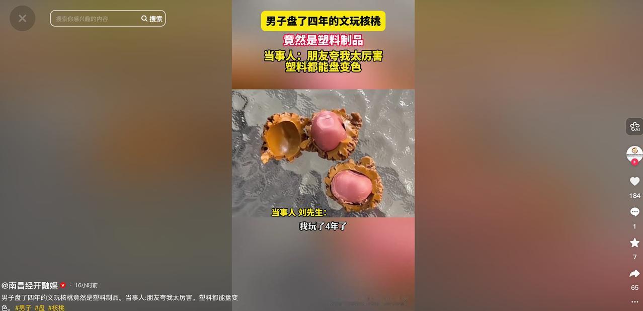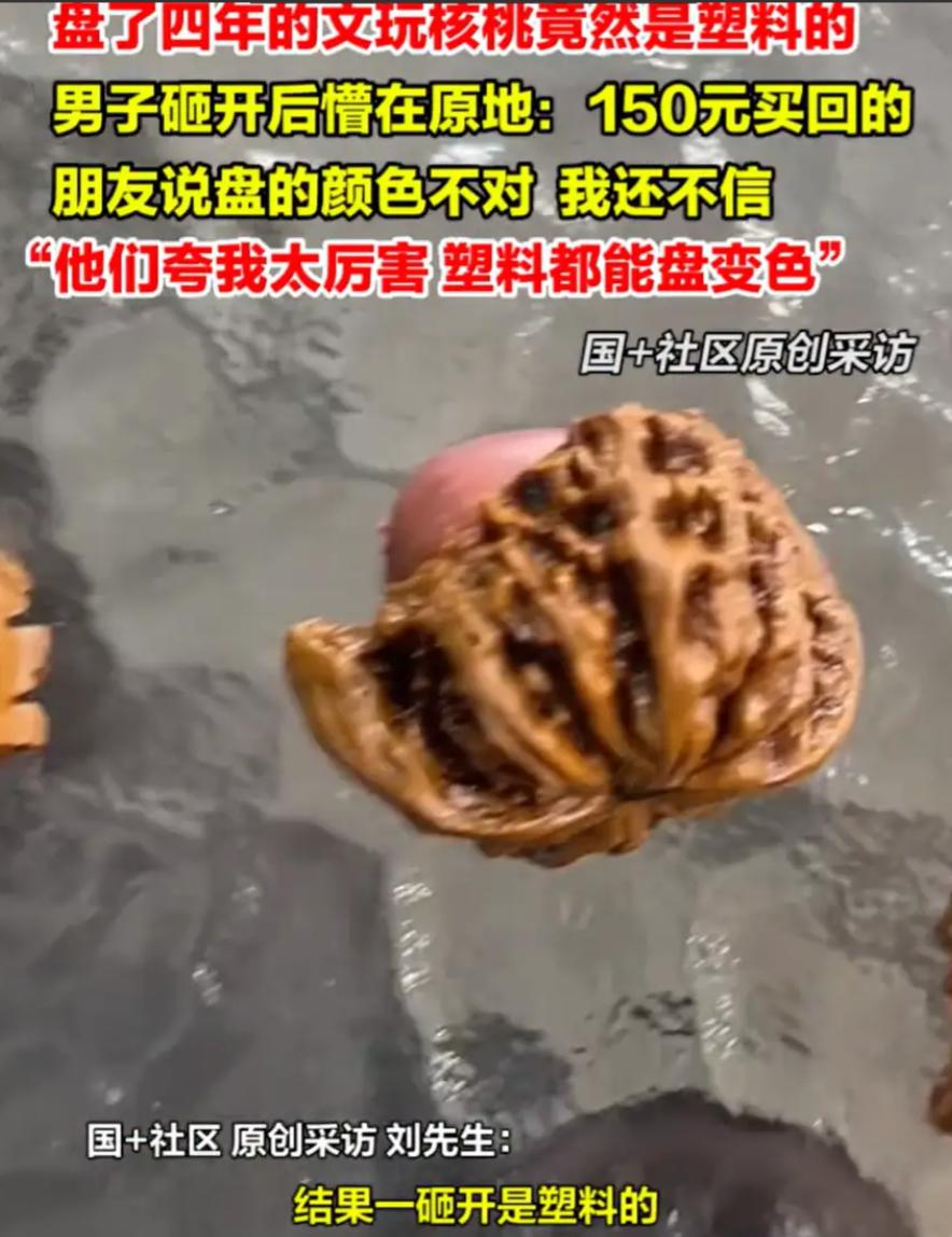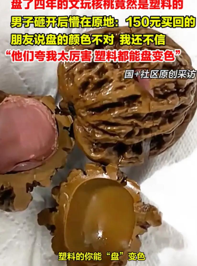 伤害性不高侮辱性极强!河北唐山,男子盘了四年文玩核桃,结果给朋友展示时,对方一眼就指出他这个有问题,一开始男子还不信,结果砸开一看,才发现是塑料的!砸开那刻估计他心都碎了,150块不说,四年感情错付给假货,这波“塑料情”属实扎心。 这对核桃当初买的时候不贵就150块钱,在文玩圈里连入门学费都算不上,顶多是个练手的玩意儿,但大哥是个实在人,既然买回来了就当成正经宝贝伺候。 整整四年啊一千四百多个日子,不管每天上班多累心里多烦,只要把这俩核桃攥在手里搓揉,就觉得踏实,每天雷打不动两小时,手上的油脂汗液一层层沁进去,核桃被盘得油光锃亮,红得透亮,那层让所有玩友都惦记的包浆,看得大哥心里美滋滋的。 这对核桃早就成了他的骄傲,平时跟朋友聚会、邻里串门,总得掏出来显摆显摆,在他眼里这哪儿是150块的地摊货啊,分明是自己四年耐心和功夫的见证,是实打实的“勋章”,身边人看这核桃盘得好,也都跟着夸,更让大哥对这俩宝贝宝贝得不行,连摸都不让别人随便摸。 转折点就出在一个懂行的朋友上门串门上,那天大哥又照常拿出核桃显摆,结果朋友还没上手,就远远瞅了一眼,脸色就有点不对了,凑过来拿在手里掂了掂,又对着光仔细看了看纹路,没一会儿就直截了当地跟大哥说:“兄弟你这核桃不对劲,看着像假的。” 这话一出来大哥当时就不乐意了,自己亲手盘了四年的东西,手感早就熟得不能再熟,怎么可能是假的?他当场就跟朋友辩解,说朋友肯定是看走眼了,甚至还想跟朋友打赌,就为了证明自己这宝贝是真的,但朋友那笃定的眼神,还是像一根刺一样扎进了他心里,让他越想越不踏实。 这份疑惑越积越重,最后大哥实在熬不住了,干脆下了个“玉石俱焚”的决心,砸开看看!与其说是验证真假,不如说他是想砸出个果仁来打朋友的脸,可当锤子真的重重落下去,核桃“咔嚓”一声裂开的瞬间,空气都仿佛凝固了。 预想中果仁破碎的声音没出现,取而代之的是塑料碎裂的脆响,大哥凑过去一看,当场就愣住了,裂开的核桃里根本没有什么错综复杂的果壳内壁,更没有核桃仁,只有几坨颜色均匀的实心塑料渣,这一下大哥半天说不出一句话来。 说真的150块钱真不算多,丢了也不心疼。但让他心塞到不行的是,自己整整四年的时光,两千多个小时的盘玩,竟然都错付给了这么一坨毫无灵魂的塑料,这四年里他把所有的耐心和喜爱都倾注在这对“宝贝”上,每天靠它解压、找清静,结果到头来,陪伴自己的竟然是个工厂流水线上下来的化学合成物。 这事儿后来传到网上,不少人看了都笑,但笑完之后都觉得这侮辱性实在太强了,现在的文玩造假真是越来越逼真,不是以前那种一眼就能看穿的地摊货了,造假的商贩能用塑料注模做出跟真核桃几乎一样的纹理,甚至还能考虑到后期盘玩变色的效果,把工业制品做得比真的还“规整”。 大哥之所以被骗四年,说白了就是太相信自己的手感,也低估了造假技术的逼真度,天然的核桃因为生长环境不同,纹理肯定有细微差别,手感也不可能完全均匀,可他手里这对塑料核桃,偏偏因为太“完美”露出了马脚,但大哥在长期的自我暗示里,把这种工业的“死板”当成了品相的“优越”,才有了这场长达四年的误会。