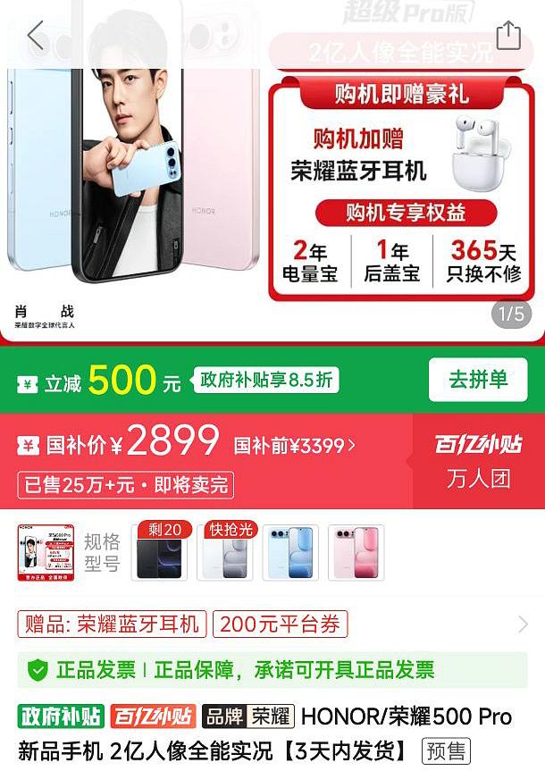 荣耀直接掀桌子,荣耀WIN系列正式发布之前,荣耀500 Pro突然降价 12G+256G标配版现在是2899元,比之前降了700,压力再次给到了友商 据说这次荣耀WIN系列也很香,但是定位游戏旗舰,所以是女性或者偏向时尚外观的网友,我觉得可以不用等了,荣耀已经帮你们安排的明明白白 荣耀500 Pro的外观设计有多经典已经有目共睹,同时用的是骁龙8至尊版芯片以及8000mAh青海湖电池,而且有2亿像素主摄,正面是6000nit高亮阳光屏 感觉接下来又有好戏看了,估计荣耀500 Pro和荣耀WIN两部产品也要互卷一波