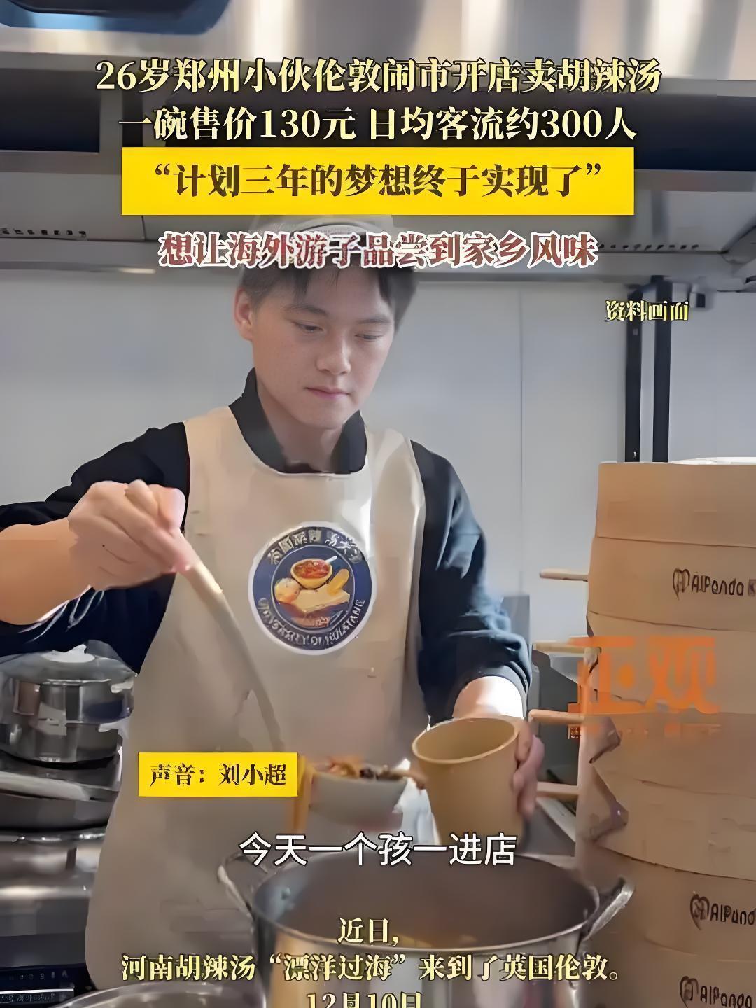 疯了?郑州小伙伦敦卖胡辣汤,1碗130元!老外排队抢,华人喝哭:是乡愁的味! 河南胡辣汤在伦敦火炸了!26岁郑州小伙刘小超,在伦敦国王十字车站旁开了家胡辣汤店,一碗卖13.8英镑(约130元人民币),竟是国内价格的10倍多,网友吵翻的同时,店里每天却排起长队,日均客流300人,三分之一还是金发碧眼的老外! 这碗“天价胡辣汤”的背后,藏着游子的乡愁与硬核坚持。刘小超留学英国时,天天馋家乡那口热辣鲜香的胡辣汤,看着伦敦街头冷面包、冷牛奶的早餐市场,干脆决定把家乡味搬过来——从没下过厨的他,花一年半自学熬汤,云南虫草花、山西黄花菜、河南秘制汤料,全从国内海运,坚决不迎合老外口味改配方,直言“改了就不是正宗中国味”。 130元的定价看着离谱,实则成本高到吓人:50平米的店面月租近10万人民币,员工时薪比当地平均水平高15%,单批次原料跨国运费就超2万,分摊下来每碗汤的成本根本不低。有伦敦顾客尝完直言“值”,华人留学生喝第一口就红了眼:“就是老家早餐摊的味,瞬间想家了”,老外们吃得满头大汗,直呼“amazing”,还跟着学河南话、打听少林寺。 网友们却吵疯了:支持派说“这是硬核文化输出,乡愁无价”,反对派骂“割同胞韭菜,纯属情怀溢价”。更有意思的是,开业前三日他还定了9.42英镑的特价,对应1942年勾起华人集体记忆,短视频单条播放量破200万,饥饿营销+情感共鸣玩得超溜。