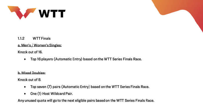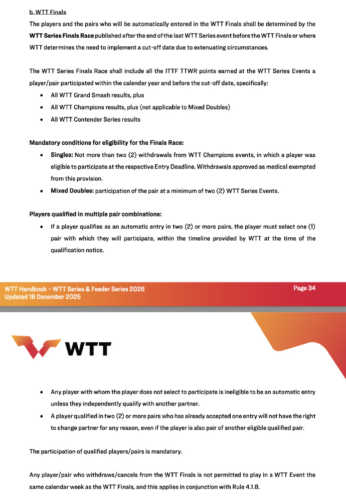 2026WTT总决赛丨赛制变更🔶总赛程由5天变更为6天2026WTT总决赛改为6天🔶混双取消小组循环赛,改为8强淘汰赛🔶WTT总决赛积分榜计算方式变更,2026WTT总决赛球员/组合积分榜=在所有大满贯赛事中所获积分+在所有冠军赛赛事中所获积分(混双不适用)+在所有挑战赛赛事中所获积分🔶新增参加总决赛积分榜的强制性条件• 【单打】WTT冠军赛中,球员在相应的报名截止日期前符合参赛资格时最多只能退赛2次。因医疗原因获准退赛的球员不受此限制。• 【混双】该组合至少参加2站WTT系列赛