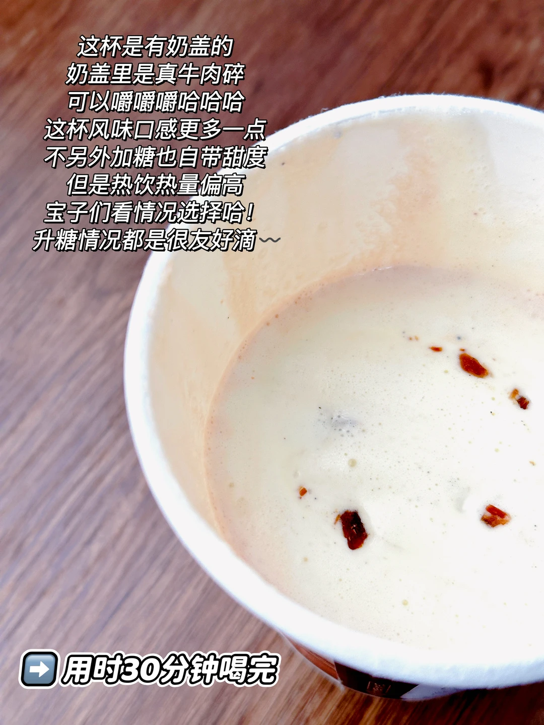 这杯是有奶盖的,奶盖里是真牛肉碎,可以嚼嚼嚼哈哈哈〰️这杯风味口感更多一点,不另外加糖也自带甜度,但是热饮热量偏高,宝子们看情况选择哈!升糖情况都是很友好滴〰️