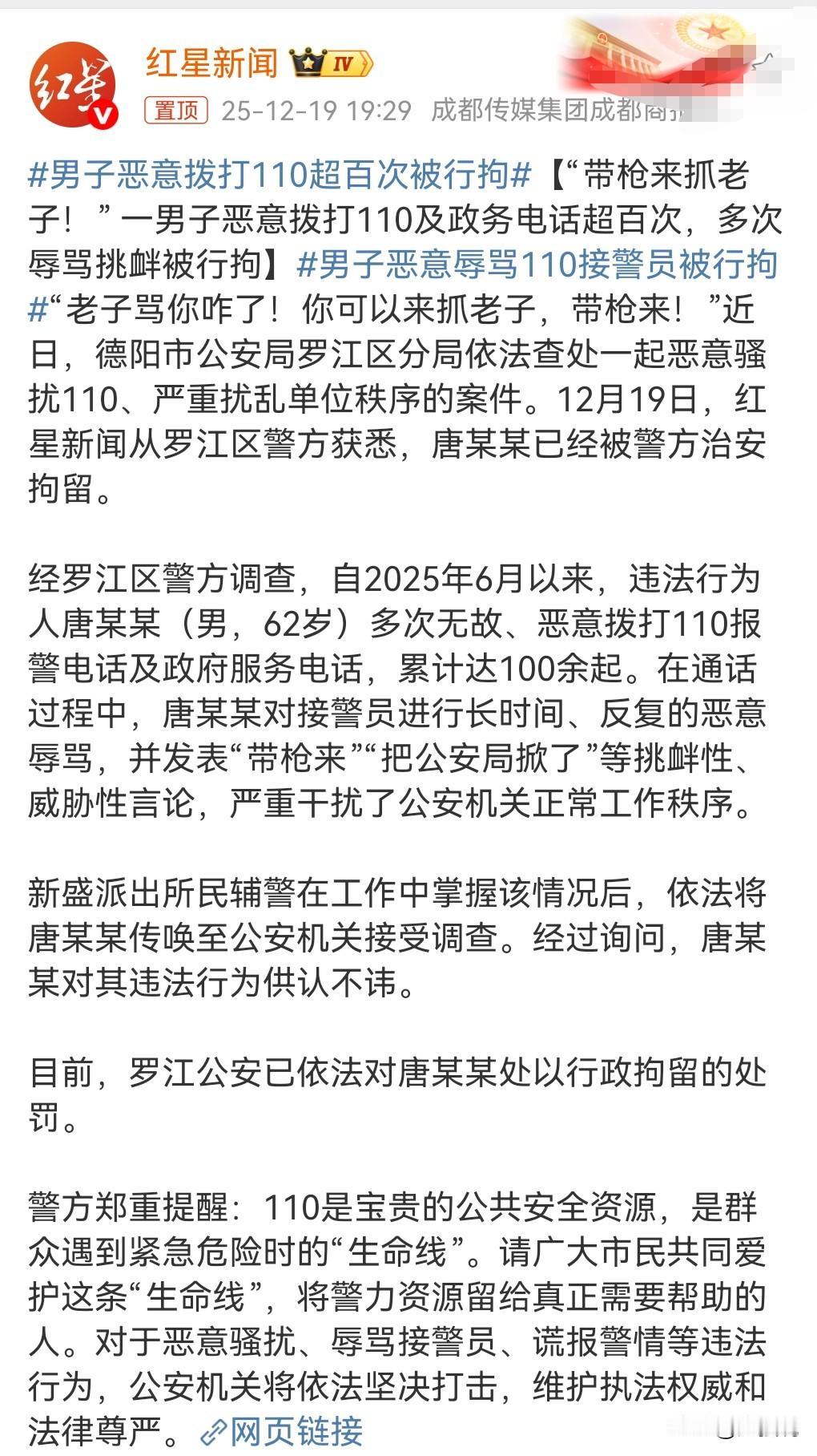 这真是太嚣张了,太无法无天了。 近日获悉。 1名62岁男子恶意拨打110超百次被行政拘留。 竟然拨打了100多次,这可真是没事找事啊。 一把年纪了怎么还跟小孩子一样的胡闹啊? 他多次辱骂挑衅,他说:“老子骂你咋了?你可以来抓老子,带枪来。” 从2025年6月以来,拨打了100次报警电话。 终于在近期被抓,真是大快人心啊。 生活中这种无聊的人不少,有事没事总爱拨打110报假警。