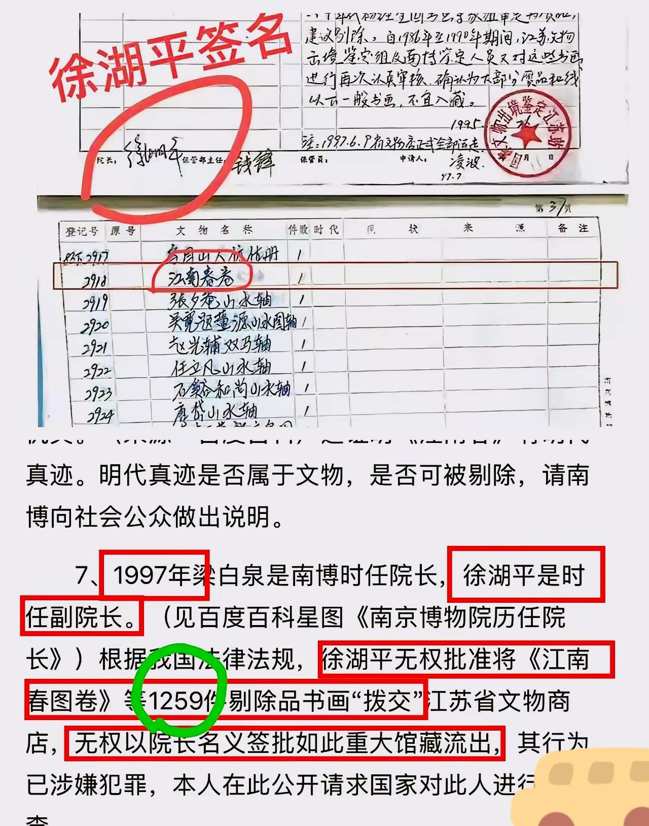庞家的5幅画没了只是冰山一角! 虽然徐湖平现在说自己已经80岁早自己不参与那些事了,但这张字条就是实打实的证据。 分明是砸了文博行业的信任! 82岁徐湖平一边说“没经手”,一边有他签字的拨交单铁证,当年又当南博领导又兼文物总店法人,这不就是自己批自己收吗? 更气人的是,2001年刚升院长,4月就把画6800元贱卖,转头成了8800万拍品。 甩锅给已故的姚迁院长,拿“死无对证”当挡箭牌,1259幅剔除品背后,到底还有多少没说清的猫腻? 核心根本不是画的真伪,是捐赠人的知情权被无视,国有文物处置流程成了摆设。 现在文旅厅都成立专班了,你觉得这事儿能查出彻底的真相吗?