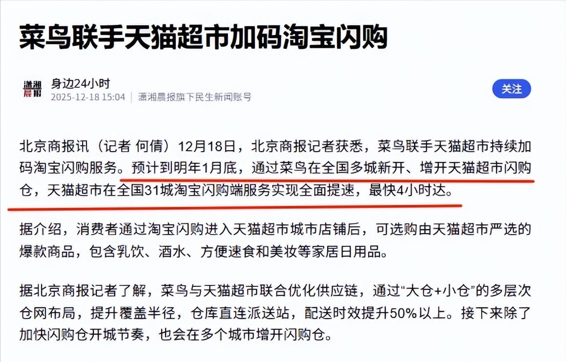 阿里生态太能打了,菜鸟、天猫超市、淘宝闪购这次联合起来搞大事,直接要在全国30多个城市开闪购仓! 很多人应该都看到新闻了,预计1月底,菜鸟将助力天猫超市在全国31城淘宝闪购端服务实现全面提速,在配送时效上实现最快4小时送达。 早上刚想起家里牛奶喝完了,打开手机下单,中午就能收到;下午突发奇想囤点零食,傍晚快递就敲开了门。这种“即时满足”的购物体验,很快就要覆盖全国31座城市。 近期一则行业动态引发关注,一批企业联手加码闪购服务,计划在明年1月底前,通过在全国多城新开、增开闪购仓的方式,实现最快4小时送达的配送新速度。 这场时效升级的背后,是一套“大仓+小仓”的多层次仓网布局在发力。简单来说,就是不再依赖单一的大型仓储中心,而是在城市各个区域布局小型闪购仓,把消费者常买的爆款商品提前储备在身边。 这些闪购仓直接对接配送站点,省去了长途运输的中间环节,配送时效比以往提升50%以上,真正实现“上午下单下午到,下午下单当天到,夜间下单次晨到”的精准履约。 此次布局的闪购仓,覆盖的商品品类十分贴近日常需求,从乳饮、酒水、方便速食等食品类,到美妆、日化等家居日用品,基本能满足消费者即时性的购物需求。而这一布局并非凭空出现,而是精准契合了当下的消费趋势。 如今越来越多的人尤其是年轻群体,早已习惯“动动手指,商品即刻到家”的购物模式,不再愿意为了日常用品特意出门,也不想忍受漫长的快递等待。 相关行业报告显示,即时零售市场正保持蓬勃增长态势,预计2030年市场规模将突破2万亿元。此前数据也印证了这一趋势,2023年我国即时零售规模已达6500亿元,同比增长28.89%,增速远超同期整体网络零售增速,成为居民消费的新增长点。 尤其是18-35岁的年轻群体,比如大学生和小家庭用户,对“即时性满足”“确定性送达”的需求尤为强烈,这部分群体也成为此次闪购服务瞄准的核心用户之一。 对商家而言,闪购仓的布局更是打开了新的增长空间。以往线下门店的销售半径有限,只能服务周边几公里的顾客,而借助闪购仓的线上联动,商品的覆盖范围大幅扩大,能触达更多潜在消费者。 已有数据显示,不少品牌接入类似闪购服务后,订单量实现快速增长,部分品牌月环比订单增长甚至超过10倍,周末的闪购订单量更是明显高于工作日,足见市场需求的旺盛。 值得注意的是,这次全国范围的闪购仓布局,也是零售行业转型升级的一个缩影。随着数字化和智能算法的不断应用,物流配送的调度效率持续优化,全链路的履约服务能力不断提升。 企业不再只比拼商品价格,而是转向比拼供应链效率和服务体验,这种竞争模式的转变,最终受益的还是消费者。 除了一二线城市,即时零售的服务范围还在逐步向县乡下沉。此前春节期间,不少县城的便利店凭借即时配送服务,日均订单量较平时上涨约40%,酒水饮料、美妆用品等商品销售火爆,返乡年轻人的“即时备年货”需求被充分激活。 此次31城的布局完成后,预计会进一步带动更多城市加入时效升级的行列,让即时零售的服务网络更加完善。 从最初的餐饮外卖,到如今的商超百货即时送达,即时零售正在不断拓展消费场景、丰富商品品类,成为扩内需、促消费的重要支撑。 这次全国31城的闪购时效升级,不仅是一次企业间的合作布局,更在推动整个零售行业朝着更高效、更贴近消费者需求的方向发展。 对此,你们有什么看法,欢迎评论留言~