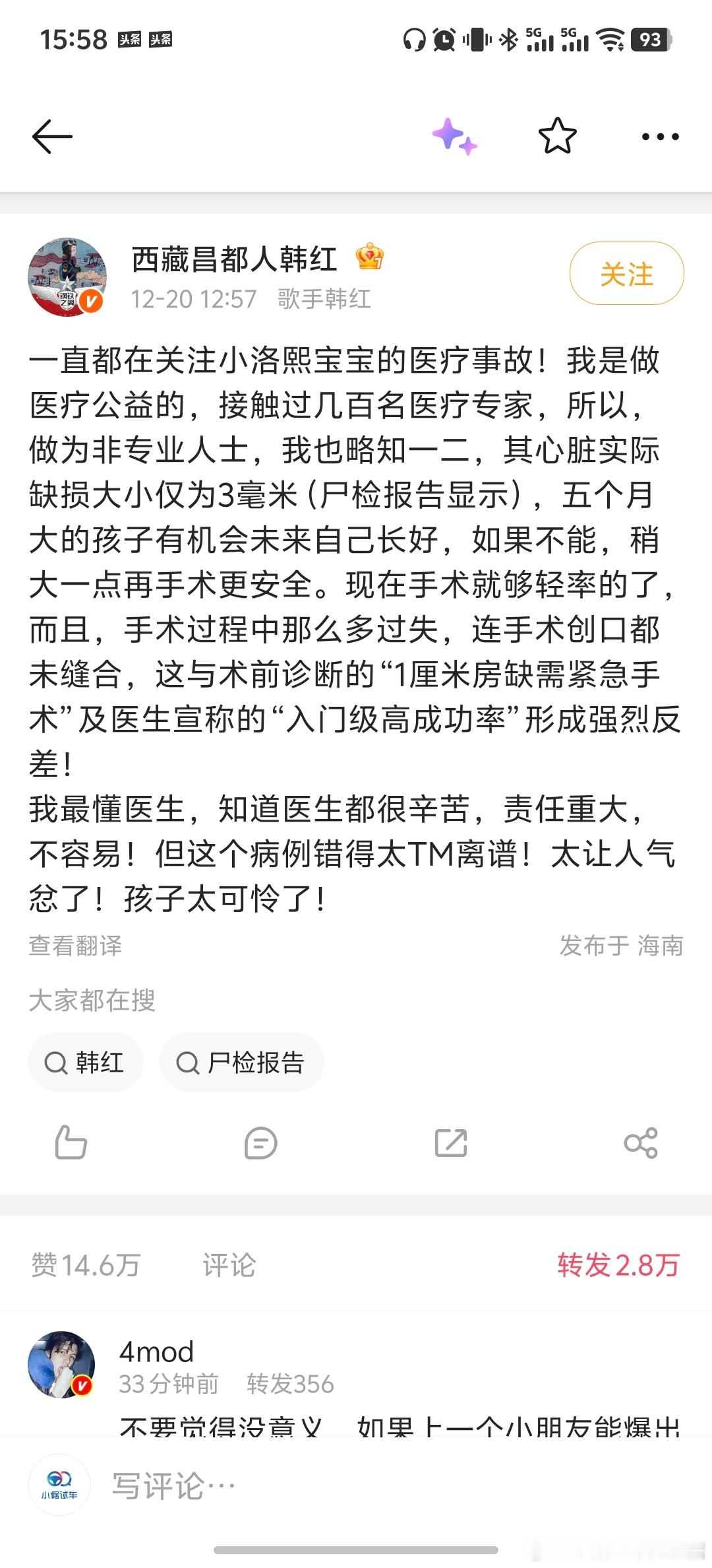 韩红为小洛熙宝宝发声 越来越多明星站出来,关注度越来越高了,不再是民间自发的、出现在热搜评论区的一段又一段复制粘贴的发声。当全国这么多双眼睛都在盯着的时候,有关部门调查结果出来了吗?倨能聊