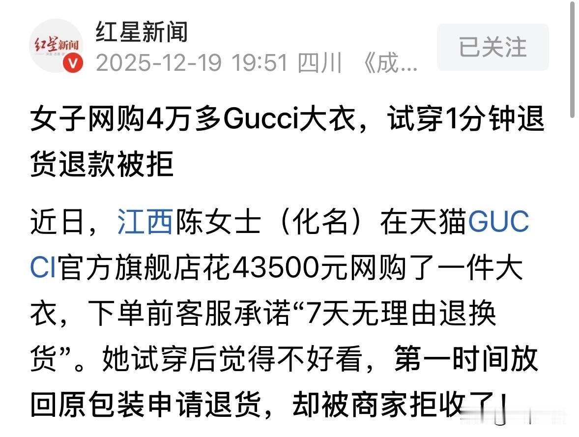江西,女子花43500元,买了一件Gucci大衣,到货后,她觉得自己穿着不好看,就申请7天无理由退货,并原封不动退了回去,谁料,商家却拒收大衣,不同意退款,原因是腰部有一处脱线了,没法再二次销售。女子惊讶表示,自己就试穿了1分钟,根本没注意腰部,她怀疑衣服发来时就是残次品,是之前试穿的客人弄坏的,却把锅甩她头上,商家却一口咬定,就是女子为之,没法退款。 陈女士前阵子花43500元买了件Gucci的大衣,寻思犒劳犒劳自己。 下单前她特意看了,衣服支持七天无理由退换,如果不合适可以退回去,她这才放心付了款。 等了2天,快递小哥把她的快递送上了门。此时,陈女士还沉浸在拿到新衣的喜悦中。 这深灰色羊绒大衣裹着黑金包装纸,丝带系得整整齐齐,防尘罩摸起来滑溜溜的,看着就是几万块大衣该有的品质。 不过,衣服上身后却不如她想象中好看。 她站在穿衣镜前套上大衣,左看右看总觉得颜色衬得自己脸色发暗,且显得腰身臃肿。 前后试穿加起来不到1分钟,她就果断脱下来叠回原样,吊牌原封不动挂好,包装盒重新封得严严实实,当即点了退货申请。 这包裹怎么寄来的,陈女士就怎么退回去,衣服和包装没有任何变动。 退货当天顺丰小哥来取件时,也检查了包装。他知道这是奢侈品牌的衣物,非常贵重,所以多留了个心眼。 没想到,商家受到退货后,直接拒收,还驳回了陈女士的申请,拒绝为她退款,原因是腰部有脱线损坏。 陈女士看着拒收消息,傻了。她就试穿了1分钟,压根也没留意到腰部的细节,哪有功夫把衣服整脱线?这衣服怕不是寄来时就是残次品吧! 可Gucci仓库发来的质检照片显示,衣服腰部装饰缝线处,有半厘米左右的丝线翘了起来。 陈女士说,我试穿时根本没碰腰部,这线头指不定是之前别人试穿时蹭的…… 客服却说,仓库出库前有三道质检,不会给客人发有问题的衣物,我们也无法还原您试穿成衣的状态。 言下之意就是,这肯定就是陈女士弄的。 陈女士没干过的事,肯定不会自己认了,她多次和客服协商,说万一这衣服本来就是残次品,是之前顾客试穿时弄坏的,凭什么要我来买单呢? 客服却只重复那套说辞:仓库质检流程严格,无法还原试穿状态。 这半个月里,43500元货款像块大石头压在她心头。她试过找消费者协会投诉,也想过打官司,可一想到要耗时耗力搜集证据,又觉得心累。 客服那边呢,每次都客客气气说“理解您的心情”,可就是不松口。 她甚至开始怀疑,是不是所有奢侈品退货都得这么折腾?普通消费者买个贵东西,难道就得自认倒霉? 她也会懊悔,觉得当初试穿时多留个心眼,仔细检查每个针脚就好了。 可转念又觉得委屈,买个衣服还得像验货似的里外翻遍找问题吗? 有人说,支持买家退货,首先商家必须证明脱线是由该买家造成,即便成立,买家还可申请淘宝介入。 不过,为啥不拍照、拍视频,给自己留证据呢?这么贵的衣服,心太大了,我每次退货,都要拍照,商品的细节,特别是标签等,以防商家说你拽了吊牌而不给退货。 也有人说,砸手里了。奢侈品出厂很严格的,基本不会存在出厂脱线问题。明摆着买家搞砸了。 那么,从法律角度,怎么看? 《网络购买商品七日无理由退货暂行办法》第8条规定:消费者退货时应当将商品本身、配件及赠品一并退回,且退回的商品应当保持完好。商品退回时的完好标准,由销售者与消费者共同确认;未就商品完好标准达成一致的,参照本办法第九条、第十条的规定处理。 陈女士在试穿GUCCI大衣后因不满意申请退货,商家以“腰部脱线损坏”为由拒收。 那么,脱线是否构成“商品不完好”呢?商家以此为由合理合法吗? 根据《暂行办法》第9条,商品不完好主要指向“超出查验需要的过度使用”,如电子电器类商品被拆解、食品包装破损等。 陈女士的案例中,试穿时间仅1分钟,吊牌、包装完整,腰部脱线属于肉眼难以察觉的细微瑕疵,且未改变商品基本功能和外观。 这种情形更接近商品本身的质量缺陷,而非消费者使用导致的价值贬损。 如果商家无法证明脱线是陈女士试穿时造成,则不能以“商品不完好”为由拒退。 根据《暂行办法》第8条,商品完好标准需由销售者与消费者共同确认。未达成一致时,销售者需承担举证责任。 本案中,商家仅凭仓库质检照片主张“脱线损坏”,但没有提供出库时的质检记录、运输环节监控等证据,无法排除该脱线是出厂瑕疵或前序顾客试穿所致。 对于这件事,你怎么看? 欢迎关注@一案一论