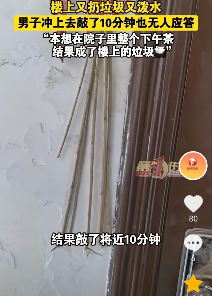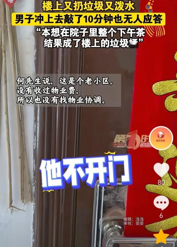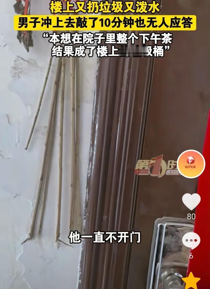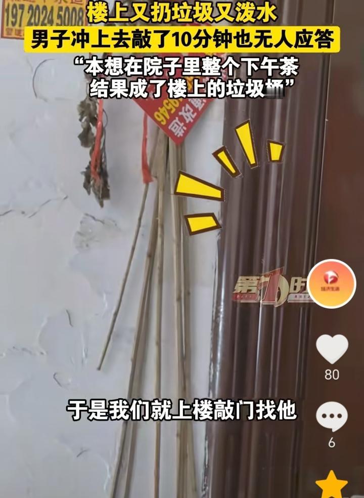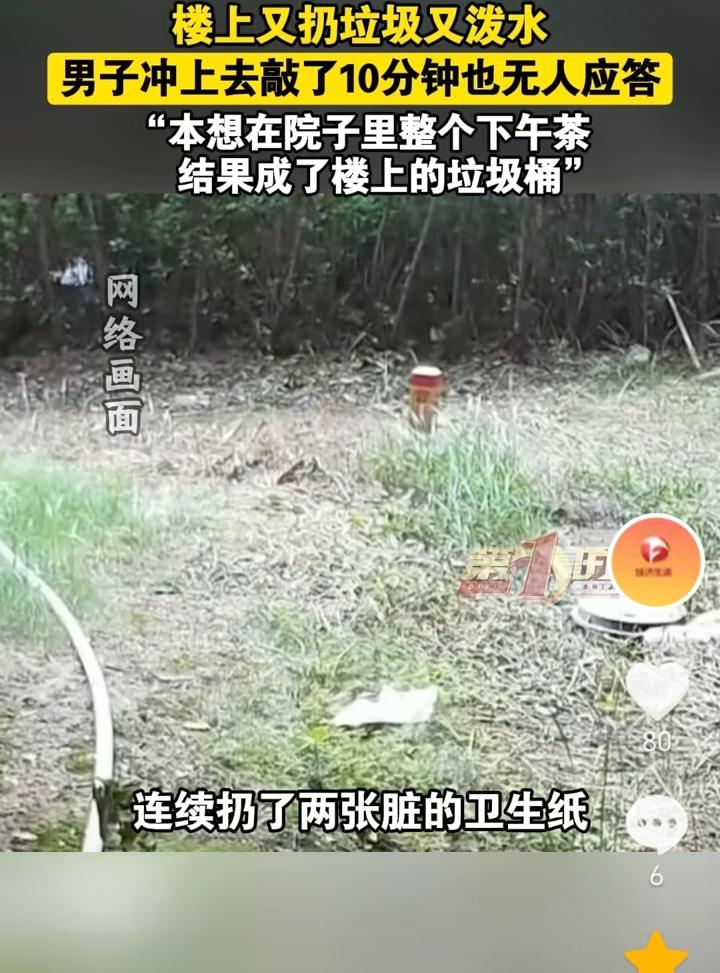 没素质!安徽合肥,男子本想在院子里整个下午茶,没想到四楼又是往下泼水又是扔用过的卫生纸,男子直接上楼敲门,敲了10分钟都无人应答,因为是老小区,没有收过物业费,所以也没有找物业协调。 又是往下泼水又是扔垃圾,楼上这是没有一点素质了,男子上去敲门,房子里肯定有人,应该是知道自己扔垃圾下去被发现,所以不敢开门面对。 男子可以安装一个监控,一方面是为了震慑一下,一方面如果楼上在扔,也可以收集证据。 作为老小区没有物业管理,卫生就需要靠大家自觉维护,互相监督了。