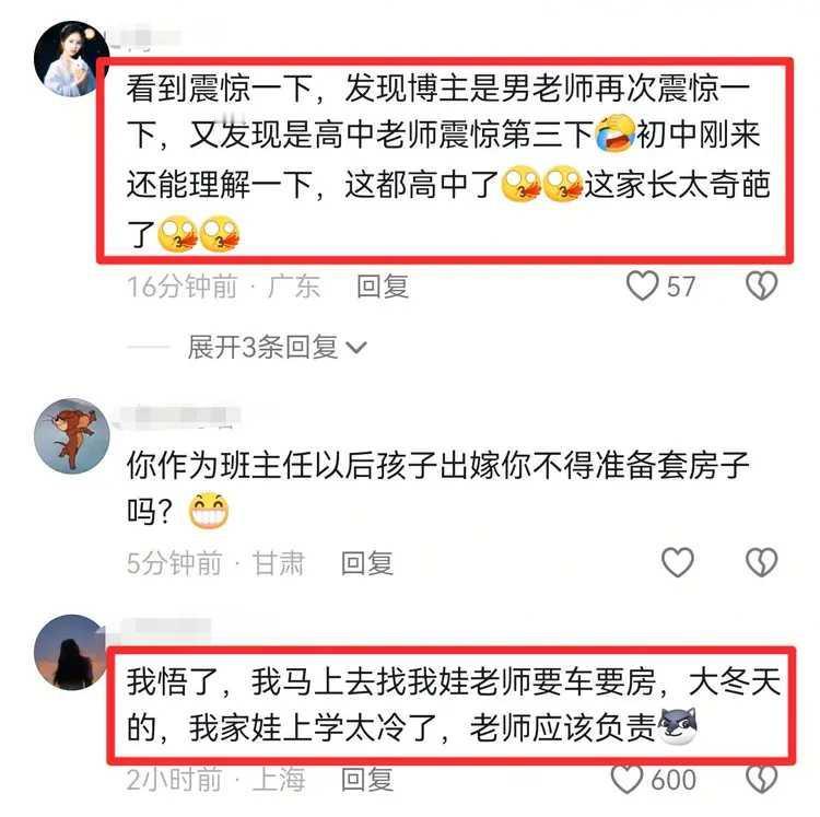 一位高中女孩来例假。 她没有准备卫生巾。 女孩父亲责问年轻的男班主任,为何不准备卫生巾。 这就有点怪了。 女孩在学校来例假了,于是去找班主任要卫生巾。 班主任是男老师,他当然也不会随时准备这玩意儿。 家长认为班主任在推卸责任。作为班主任,理应准备好学生需要的各种用品。 网友震惊了说,高中女孩来大姨妈了,竟然向老师要卫生巾。 有网友说,现在冬天了,娃上学太冷了,我马上找老师要车要房。