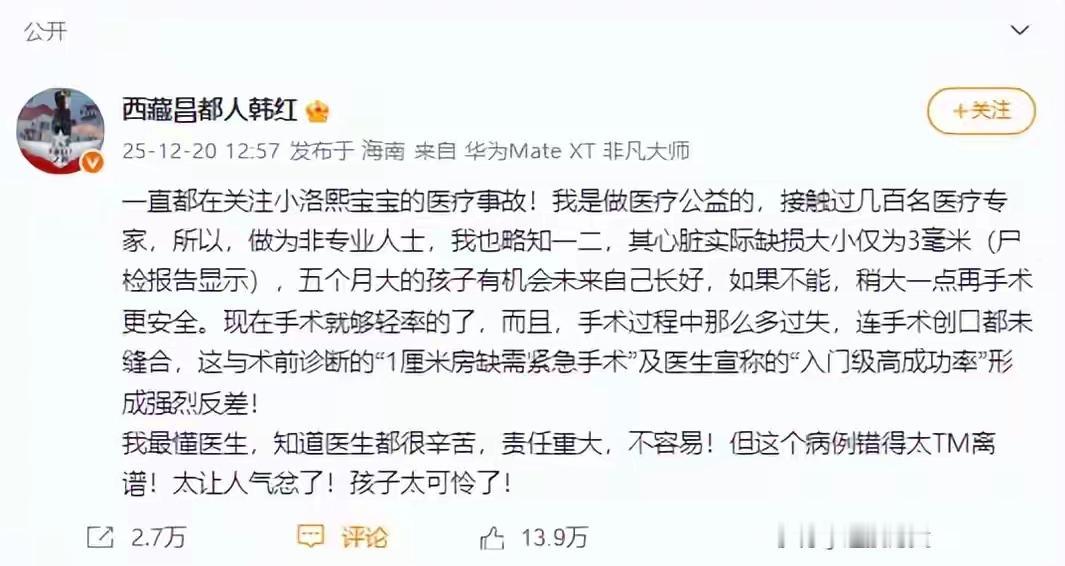 韩红说:这个病例错的太离谱!太让人气愤了!孩子太可怜了! 宁波手术后离世女婴小洛熙的尸检结果由法医刘良来做,目前有了尸检结果,看了尸检结果,真的让人泪目。 小洛熙的手术本可以不用在5个月时做的,完全可以长大以后再做手术,或者长大后就完全自愈了。她的离世是由缺血性休克造成的,肋骨间切开的口子没有缝合及多处创口未缝合。 况且医生在开胸手术没有告知家属的情况下就做手术了,没有监控且与医生告知家属的情况不符合,有隐瞒家属的嫌疑。 如今连韩红都发声,说明这起医疗事故的严重性,不容忽视,也是给医院的管理缺失一个警告吧。 小洛熙的离世令人心痛,换作任何一个家长都难以承受。作为家长我们也应该在此医疗事故中吸取教训,多跑几家医院听听医生怎么说,再做正确的选择。