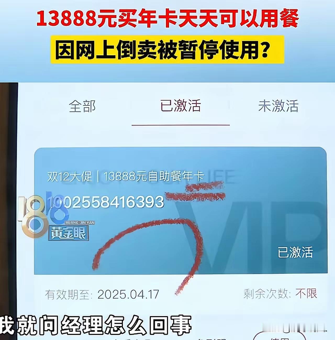 浙江杭州,一女子花费13888元购买某酒店自助餐年卡,持卡可365天每日用餐一次,折算下来单次消费仅38元。购卡时酒店明确约定,该卡仅限本人或亲友使用。不料女子使用仅4个月,年卡就被酒店停用,理由是酒店发现她在闲鱼平台倒卖卡内权益。女子对此表示不服,辩称自己并不知晓酒店有禁止二次销售的相关规则,并要求酒店退还半年卡费,却遭到了拒绝。 这张卡售价13888元,能支持365天每日用餐一次,折算下来单次消费仅38元左右。这个价格在高星级酒店里,别说吃一顿丰盛的自助餐,连一杯现磨咖啡都难买到,庞女士看中这极高的性价比,果断下单。 购卡时,酒店明确约定,这张年卡仅限本人或亲友使用,杜绝其他用途。 接下来的4个月里,庞女士享尽了“自助餐自由”的快乐,频繁出入酒店餐厅,享用各种美食,觉得这1万多块花得太值了。 可让她没想到的是,今年4月17日,这张给她带来不少快乐的年卡,突然被酒店单方面按下了暂停键。无法正常用餐的庞女士赶紧找到餐厅经理讨要说法,对方给出的理由让她始料未及,酒店发现她在闲鱼平台倒卖卡内的用餐权益。 酒店方面表示,通过后台数据监测发现,庞女士的这张年卡并未局限在她个人的社交圈分享。 在二手交易平台闲鱼上,甚至出现了高达8笔关于该卡用餐权益的交易记录。在酒店看来,这种行为已经不再是单纯的“请亲友吃饭”,而是典型的以盈利为目的的二次销售。酒店还提到,发现这一苗头后,他们并非没有给过机会,曾多次尝试提醒并制止,但庞女士并未收手,甚至开始以“亲友”的名义做掩护继续操作,为了维护正常的经营秩序,只能无奈停卡。 面对酒店的指控,庞女士觉得极其冤枉。她的想法很简单,以往购买各类餐饮券,从来都是不仅能自己用,转赠甚至转手都没人管,怎么到了这张年卡就成了违规行为?她坚称,自己压根没注意到酒店还有“禁止二次销售”的相关规则,这纯粹是一次基于过往消费经验的“无心之过”,只是想把多余的用餐权益分享给需要的人而已,并不是所谓的“倒卖”。 可在法律与契约面前,庞女士的辩解似乎很难站得住脚。酒店拿出了当初的促销页面,在页面不起眼的底部,第五条使用规则白纸黑字地写着:“限本人或亲友使用,杜绝二次销售”。这行字,成了酒店如今挺直腰杆拒绝退费的最大底气。 庞女士见卡被停用,后续的用餐体验也受到了影响,索性提出了诉求:按照年卡有效期(购买日起一年)计算,要求酒店退还剩下约合半年的卡费。但这个诉求,直接遭到了酒店的拒绝。 其实事情发展到这一步,本有缓和的余地。 酒店曾给出过一个挽回方案:只要庞女士带着身份证来签一份“停止倒卖保证书”,这张年卡就能立刻“复活”。但在庞女士看来,这个方案变了味,当初买卡凭二维码就能使用,如今却要设卡设限、签各种文件,是对她权益的二次侵犯,所以她拒绝了这个方案。 后来在11月28日,虽然年卡并未完全恢复,庞女士还是成功在酒店用了一次餐。但据她描述,这次用餐体验充满了“火药味”,她感觉自己像是被贴上了“不受欢迎”的标签,遭遇了工作人员的恶劣态度,这种心理上的不适感彻底引爆了矛盾。 为了平息事态,酒店再次退了一步,提出将卡的有效期延长到2026年11月,相当于免费送了一大段使用时长。但信任一旦崩塌,时间的补偿似乎也失去了诱惑力,庞女士拒绝了这个延期方案,坚持要求现金退赔。 目前,庞女士已经将此事反映给了市场监管部门,这场关于自助餐年卡的博弈,最终还得等待监管力量来裁决。
