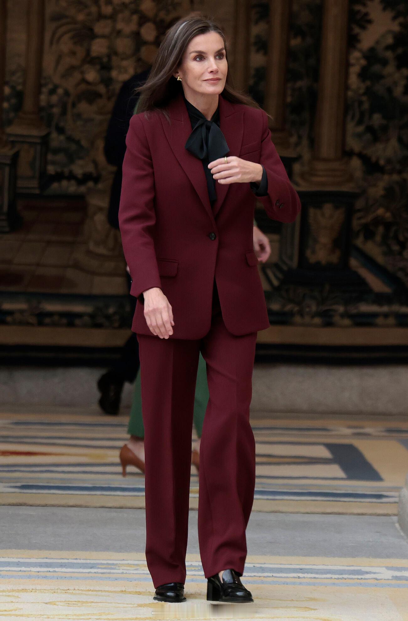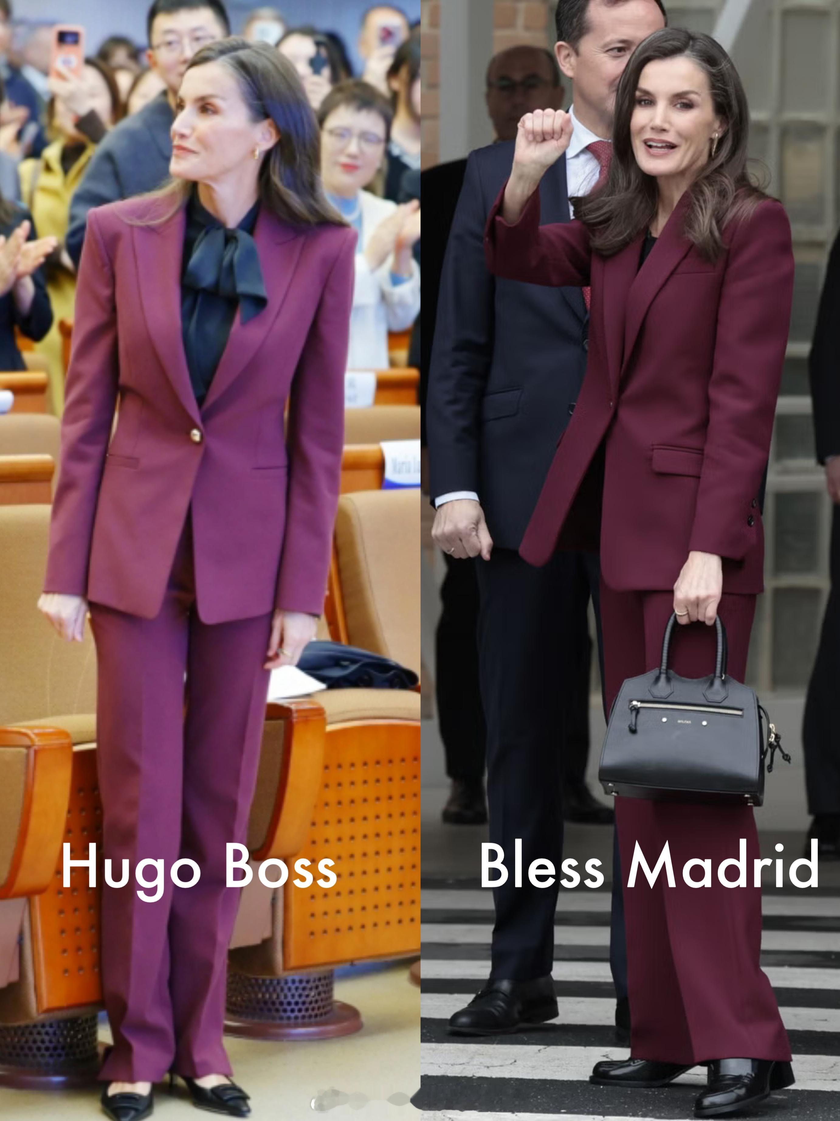 莱蒂齐亚王后的两套紫红色西装~11月份在北外出席西班牙语推广活动时,莱后穿了一套紫红色西装,搭配的Magrit低跟鞋和Pdpaola的金水滴耳环,当时看图以为是她衣柜里的那套Bleis,但其实是新的,来自她喜欢的德国品牌Hugo Boss(也给自己纠个错)。两套都是正肩收腰+戗驳领+一粒扣的设计,但Hugo Boss是挖袋口袋,Bleis的是平翻式口袋。一样的衣服,为啥要买两套?可能因为爱吧不定义穿搭如果秋冬有颜色莱蒂齐亚