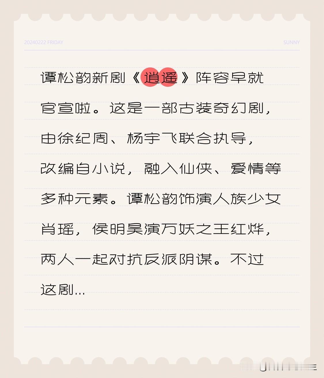 谭松韵新剧《逍遥》阵容早就官宣啦。这是一部古装奇幻剧,由徐纪周、杨宇飞联合执导,改编自小说,融入仙侠、爱情等多种元素。谭松韵饰演人族少女肖瑶,侯明昊演万妖之王红烨,两人一起对抗反派阴谋。 不过这剧播出之路坎坷。原本大家盼着,结果因侯明昊另一部戏临时提档撞了档期,延期到2024年。谭松韵粉丝可不乐意了,她出道20年头回演仙侠呢。剧有150万预约量,热搜话题达2亿,一半是骂战一半是哀嚎。虽制作方追加八千万做特效,但观众更看重档期。就看播出时,这剧能不能靠故事挽回口碑了。 谭松韵 谭松韵演技派 明星 [赞][赞][赞]