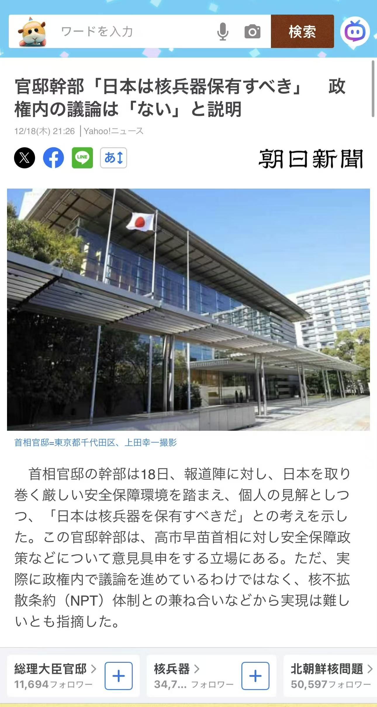 日本高级官员称日本应拥有核武器 12月18日,日首相高市早苗官邸的干部向新闻界表示,考虑到日本周围严酷安全保障环境,作为个人表示:"日本应该拥有核武器"。日本目前囤积钚材料至少47吨,理论上足以制造6000枚核弹头,日本海陆空三位一体运载投掷系统工具则是现成齐备。烽火问鼎计划 高市政权将自己逼到外交死角