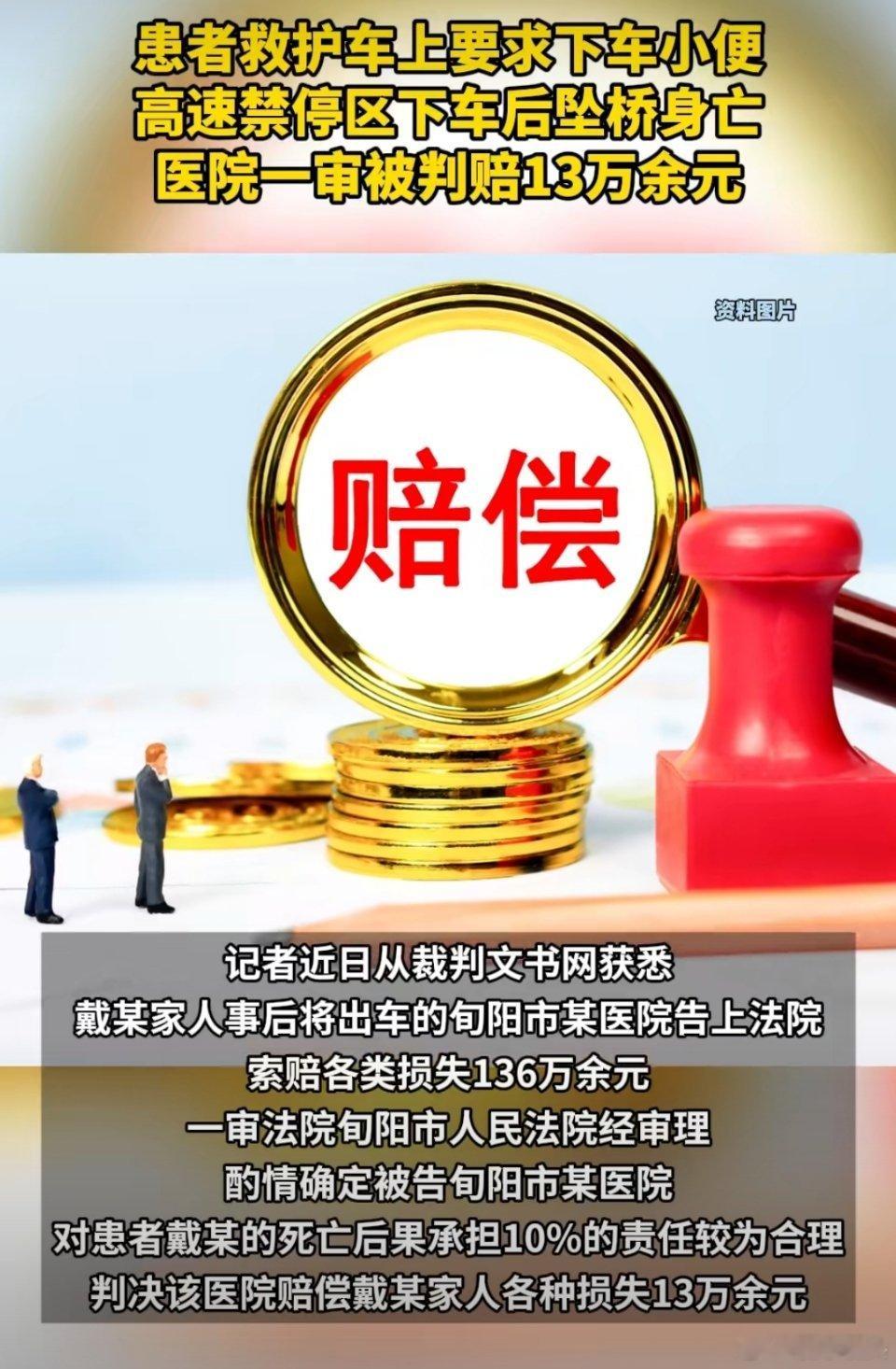 患者要求下救护车小便禁停区坠亡这对医院也太不公平了吧?这个患者明明自己作死,结果医院还要赔13万元。难道不应该患者家属给当时的医护人员赔精神损失费吗?是患者自己要下车,翻越围栏出意外的,和医院有什么关系?医护人员根本拦不住啊!