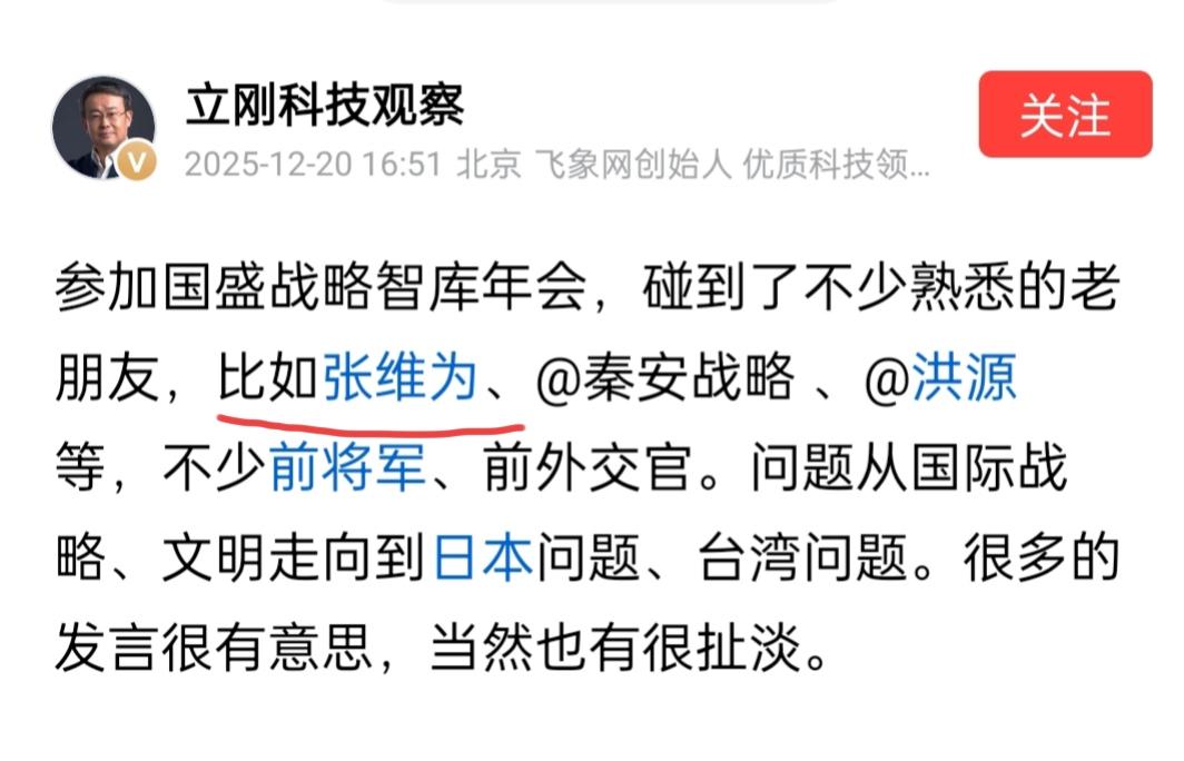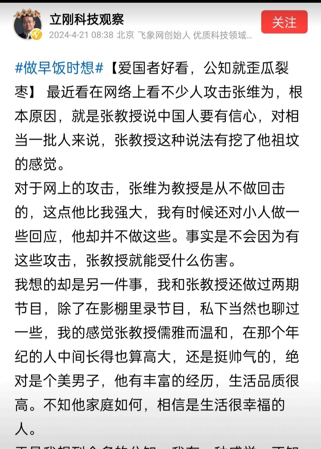 项立刚与张维为在年会上碰面了。 从项的描述中,不难看出复旦大学张维为教授是项立刚的老熟人了,也就是老朋友。 去年,张教授在网上引起争议的时候,顶立刚先生力挺张教授。当时项立刚评价张教授是一个儒雅温和、高大帅气的人,如图三所示。 在这样的年会上,两位学者当面交流,也能点亮思想的火花。