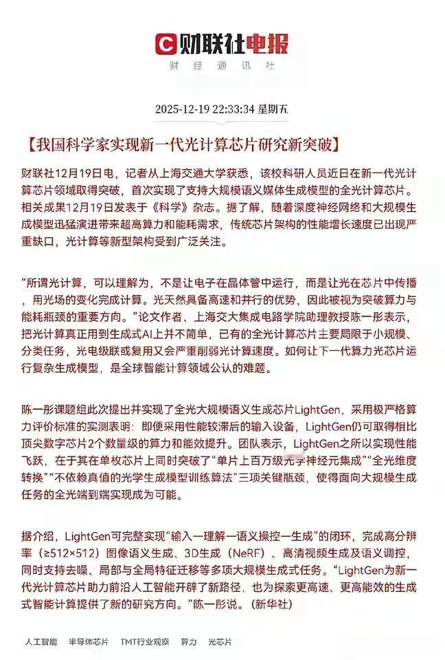 利好消息,我国实现新一代光计算芯片研究新突破,在未来,在这个光计算芯片技术将是一个新的路线,是一个新型的架构,这是在新一代光计算芯片新的一个路径发展,所以,中国目前在这科技方面的发展是有很多突出的成果!美国对中国的封锁挡不住中国的科技创新,实现技术的突破,所以,未来中国在芯片设计,芯片技术创新都有新的路线!也为我国未来科技发展打下了坚实的基础