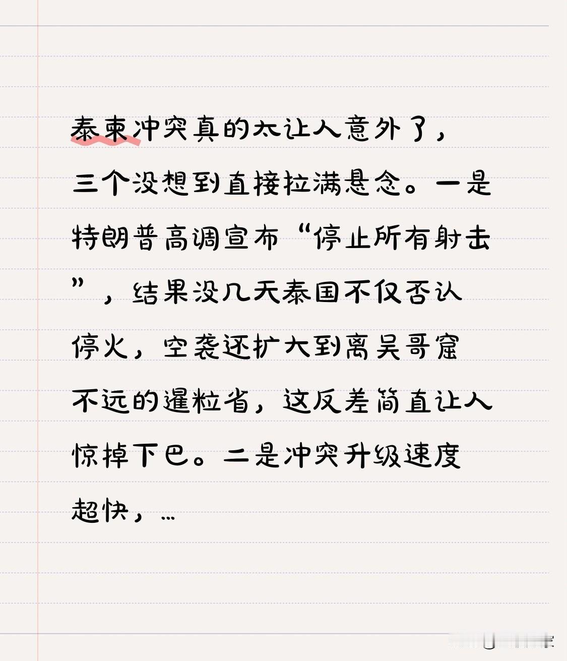 泰柬冲突真的太让人意外了,三个没想到直接拉满悬念。一是特朗普高调宣布“停止所有射击”,结果没几天泰国不仅否认停火,空袭还扩大到离吴哥窟不远的暹粒省,这反差简直让人惊掉下巴。二是冲突升级速度超快,短短一周,宵禁、戒严、封口岸等情况全出现了,新闻里都是流离失所的家庭和被炸断的桥。三是这场冲突已不是小摩擦,而是中小型战争,双方伤亡不少,受影响人群超70万,流离失所者突破50万。 这场冲突表面是领土之争,实则关乎两国生存和政治家立威。柬埔寨赌博产业吸引大量泰国游客,损害了泰国利益。 大家觉得泰柬冲突还会有怎样的发展?背后是否还有其他隐情?这场冲突又会对地区局势产生什么影响呢? 泰国柬埔寨冲突 泰柬边境冲突 柬埔寨泰国冲突 泰柬边境局势 泰国柬埔寨冲突 泰柬边境冲突 柬埔寨泰国冲突 泰柬冲突 泰柬边境局势 泰柬争端 柬泰军事冲突