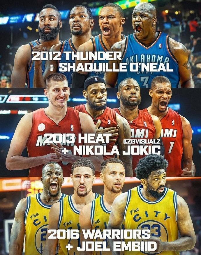 哪组最强? A:12雷霆+奥尼尔 B:13热火+约基奇 C:16勇士+恩比德 这里面,只有12年雷霆的哈登,还不是首发级别的球员,这一年也只打了2场首发,场均16.8分4.1篮板3.8助攻,和另外两组的任何球员来比,都有点落于下风。 13热火的阵容则相对接近完美了,热火当年最大的问题是内线,有了约基奇,可以站桩防守,其他人无限换防,而在进攻端,詹姆斯和韦德下快攻的能力加上约基奇的长传,堪称完美组合,这几个人,能把篮球场变成橄榄球场,约基奇和詹姆斯都能打四分卫,其他人就跑起来往前冲就完了。 而16年的勇士阵容加上恩比德,也很强,恩比德只是不愿意去内线打,他的中距离投篮很稳定,这一手造犯规,也能让其他人喝一壶,加上水花兄弟,算是投篮最准的一套组合。他们是能够和热火阵容打一打的。