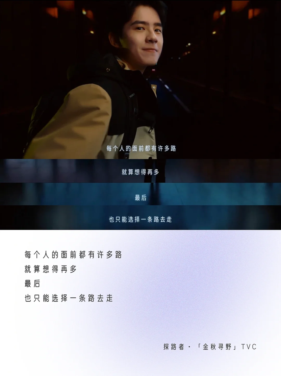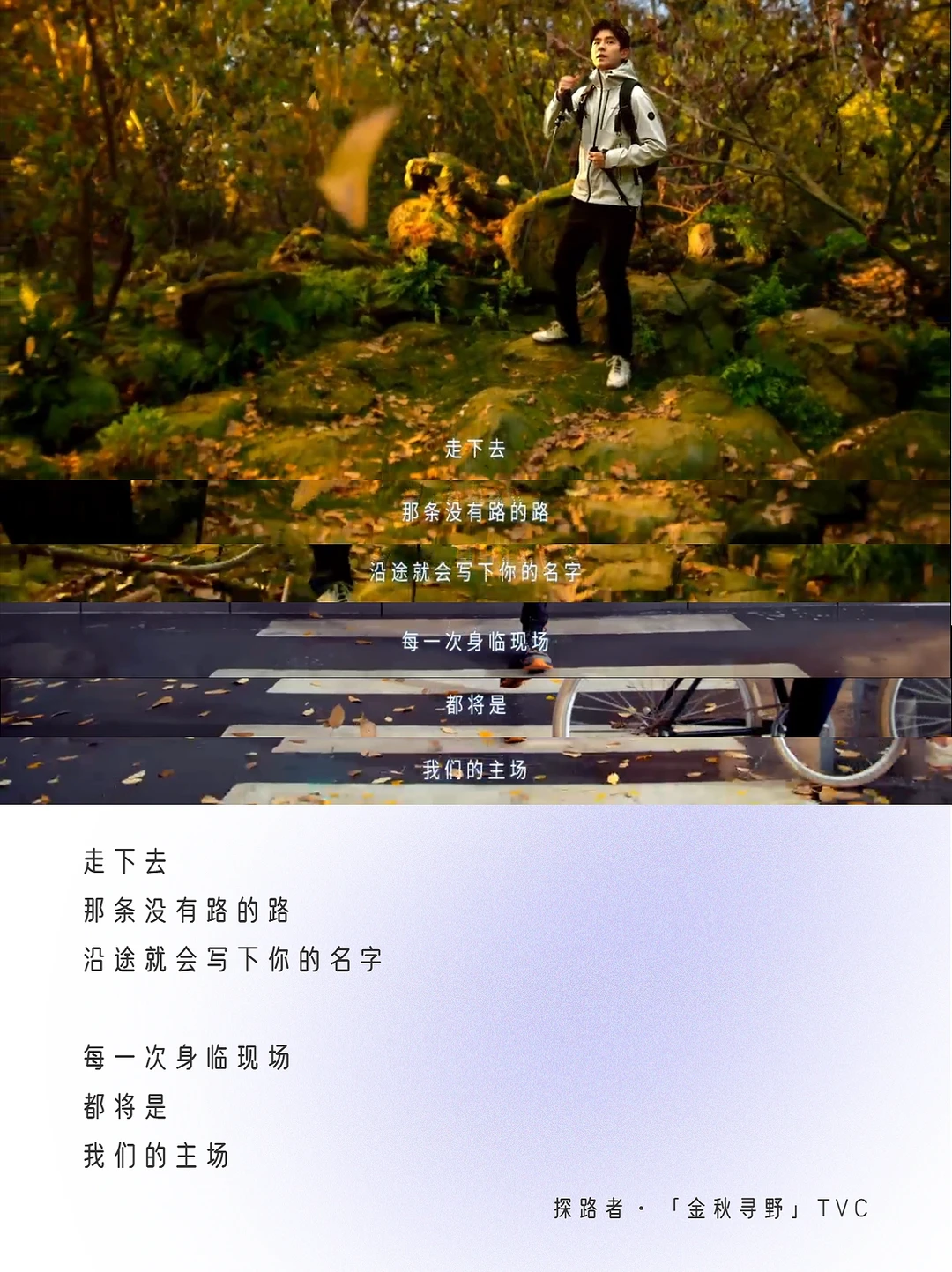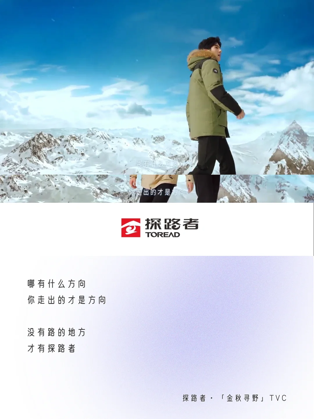 8月3日,秋冬新品发布,联合代言人刘昊然推出了第3支合作的TVC——「金秋寻野」。 这支TVC采用“一镜到底”的拍摄方式,代言人刘昊然身着不同款式探路者新装穿梭在场景之中,户外场景切换十分丝滑,与「探路者」的品牌基因相呼应,拉进与年轻消费群体的距离,切合品牌年轻化,让人看了不禁想去户外,好好“野一番”。🧗 除开代言人刘昊然的颜值和这支TVC的百万镜头,我的关注点更放在它的文案上👉🏻以“路”为线索串联多种城市和户外场景。路有两种,一种是肉眼可见,行走在你我脚下的路;另外一种,是存在心里看不见的路,路上有一座指引我们寻找自我的灯塔。 ✍🏻TVC文案金句:没有路的地方,才有探路者,写出了年轻人勇敢探索的精神——即便脚下没有路,但是有探路者的地方,你就能找到自己的方向,探险自然,探索自我❤️ 广告大师李奥贝纳有句经典之言:伸手摘星,即使徒劳无功,亦不致一手污泥。人生没有标准答案,方向亦不是一成不变,如果将人生当成一次探险之旅,大胆去闯,就像探路者一样,或许我们将拥有更多的精彩与可能。 🔵探路者「金秋寻野」纯享版文案分享如下: - 每个人的面前都有许多路 就算想得再多 最后 也只能选择一条路去走 走下去 那条没有路的路 沿途就会写下你的名字 每一次身临现场 都将是 我们的主场 不期而遇 是各自前行的终点 更是故事的起点 向前走 开始也许没有想象中那么风光 但头顶会有星光 脚下虽险峻 内心却可以无比坦荡 坚信自己 即使前路只有自己 哪有什么方向 你走出的才是方向 没有路的地方 才有探路者