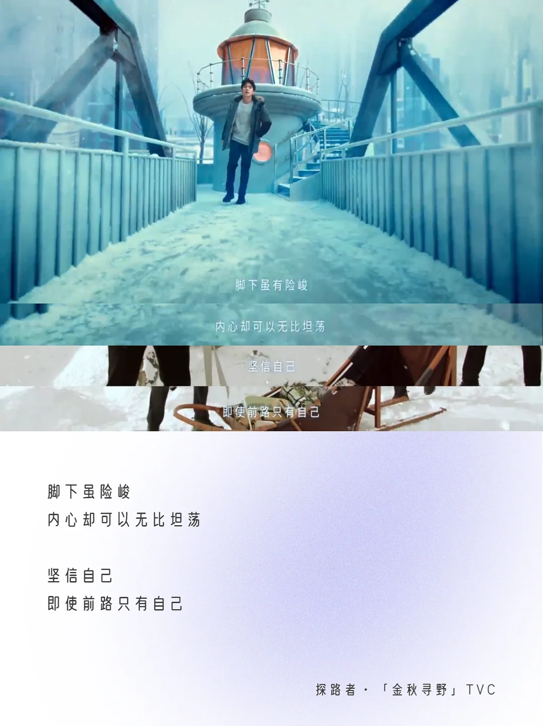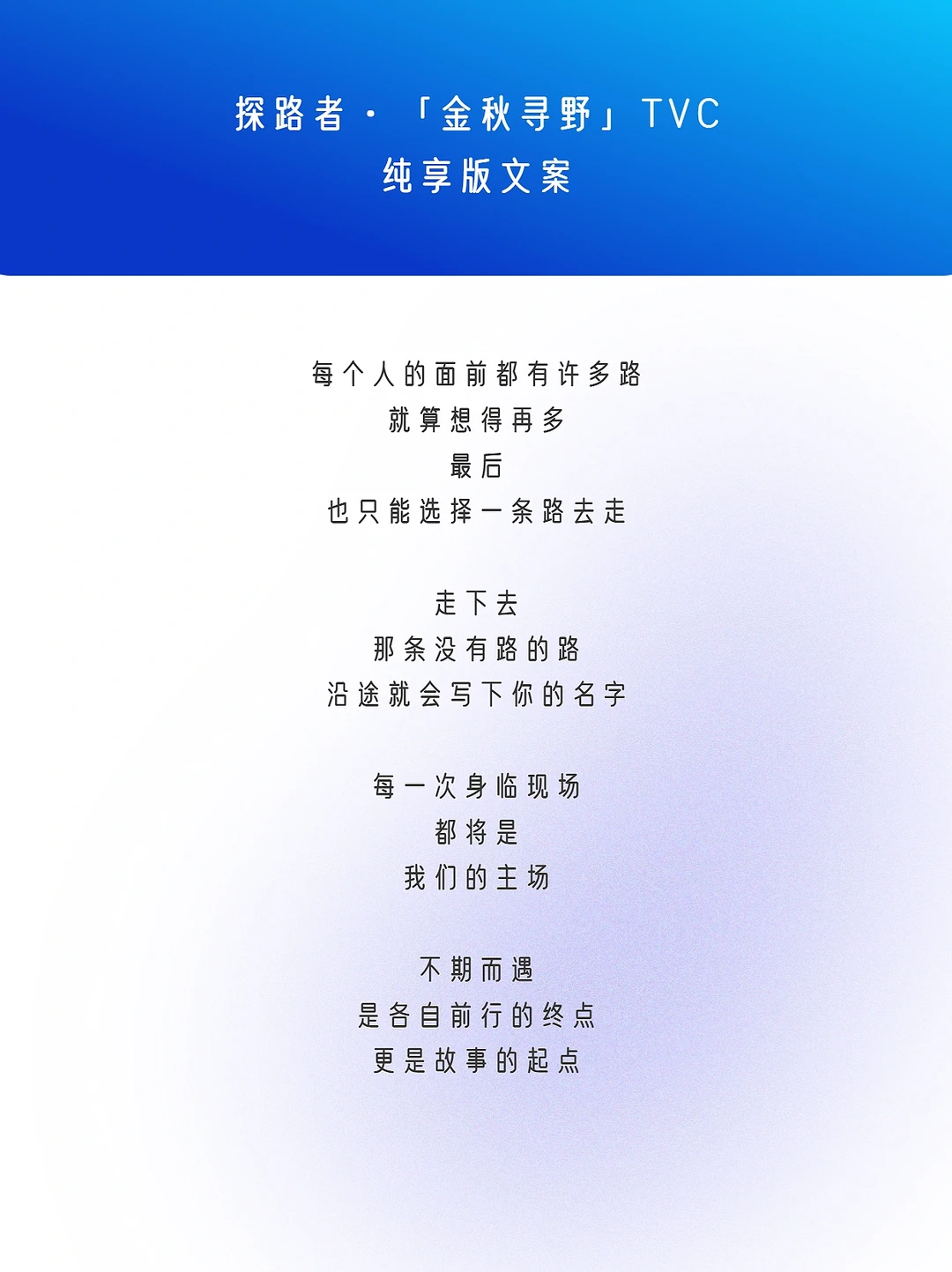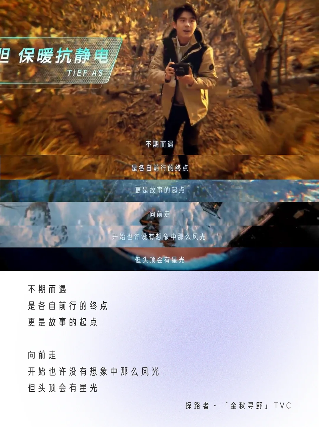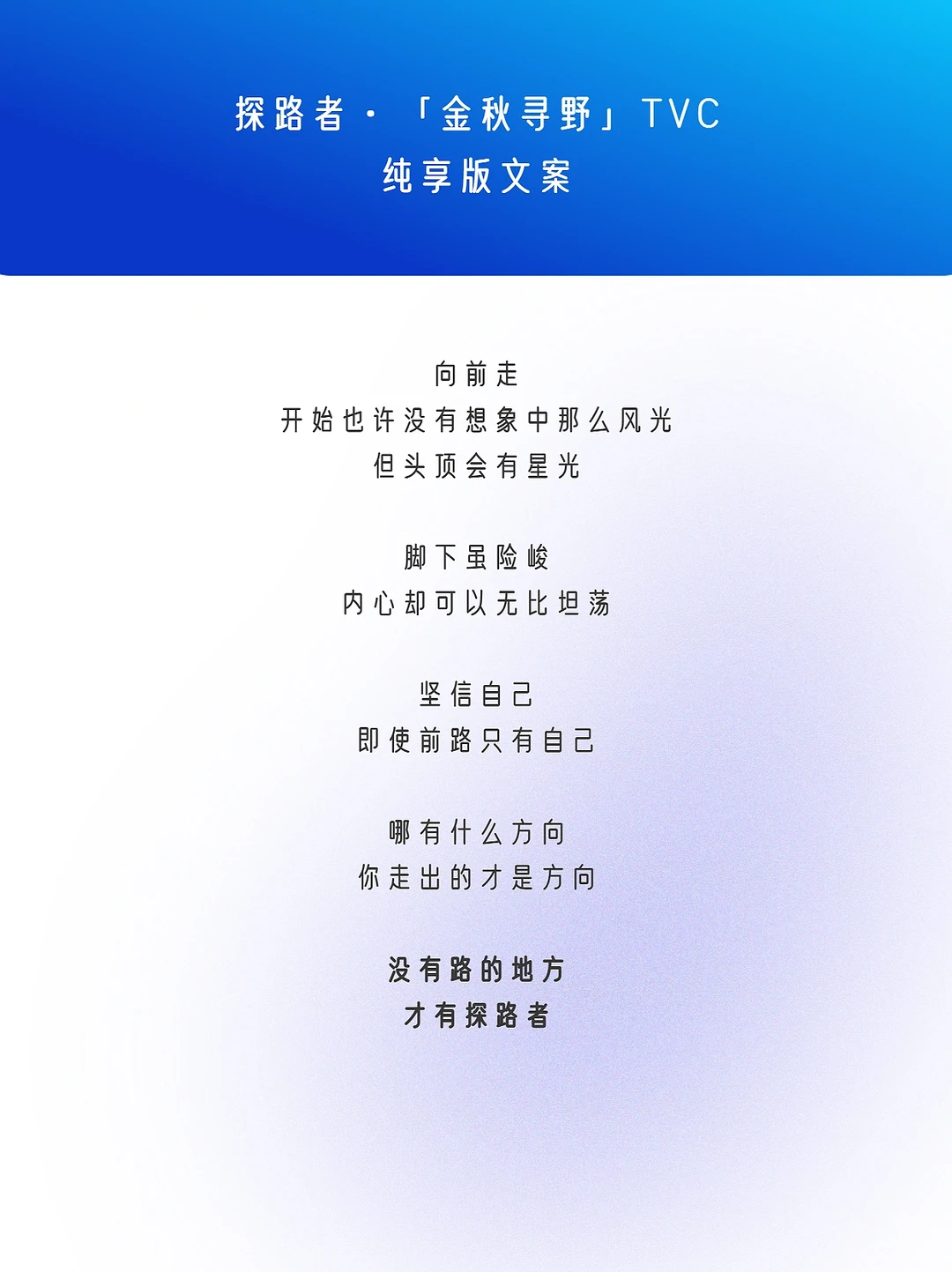8月3日,秋冬新品发布,联合代言人刘昊然推出了第3支合作的TVC——「金秋寻野」。 这支TVC采用“一镜到底”的拍摄方式,代言人刘昊然身着不同款式探路者新装穿梭在场景之中,户外场景切换十分丝滑,与「探路者」的品牌基因相呼应,拉进与年轻消费群体的距离,切合品牌年轻化,让人看了不禁想去户外,好好“野一番”。🧗 除开代言人刘昊然的颜值和这支TVC的百万镜头,我的关注点更放在它的文案上👉🏻以“路”为线索串联多种城市和户外场景。路有两种,一种是肉眼可见,行走在你我脚下的路;另外一种,是存在心里看不见的路,路上有一座指引我们寻找自我的灯塔。 ✍🏻TVC文案金句:没有路的地方,才有探路者,写出了年轻人勇敢探索的精神——即便脚下没有路,但是有探路者的地方,你就能找到自己的方向,探险自然,探索自我❤️ 广告大师李奥贝纳有句经典之言:伸手摘星,即使徒劳无功,亦不致一手污泥。人生没有标准答案,方向亦不是一成不变,如果将人生当成一次探险之旅,大胆去闯,就像探路者一样,或许我们将拥有更多的精彩与可能。 🔵探路者「金秋寻野」纯享版文案分享如下: - 每个人的面前都有许多路 就算想得再多 最后 也只能选择一条路去走 走下去 那条没有路的路 沿途就会写下你的名字 每一次身临现场 都将是 我们的主场 不期而遇 是各自前行的终点 更是故事的起点 向前走 开始也许没有想象中那么风光 但头顶会有星光 脚下虽险峻 内心却可以无比坦荡 坚信自己 即使前路只有自己 哪有什么方向 你走出的才是方向 没有路的地方 才有探路者