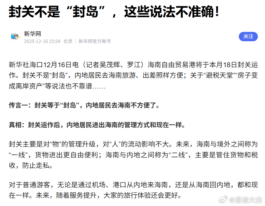 据报道,2025年12月18日起,海南自由贸易港正式启动全岛封关。封关不是“封岛”,而是对标国际最高水平开放形态的重要一步。封关后,海南全岛将成为一个“境内关外”区域,岛内可以享受零关税等优惠政策。个人短评:其实就是把海南岛建设为自由贸易港的里程碑事件。但这样一个事情,仅仅因为“封关”这个词,就由产生出一些节奏,搞得官媒还得强调,封关不是“封岛”。比如新华社还专门做了一个辟谣报道。其中提到:传言一:封关等于“封岛”,内地居民去海南不方便了。真相:封关运作后,内地居民进出海南的管理方式和现在一样。传言二:封关意味着自贸港建成了。真相:启动封关运作是自贸港建设中的重要里程碑,但远不是终点。传言三:海南会成为“避税天堂”。真相:海南的税收优惠政策有严格限定,目标是发展实体经济,绝非打造“避税天堂”。传言四:海南的房子会变成“离岸资产”。真相:海南房产仍受国内法律和政策约束。只能说,今年的节奏真的是多如麻。封关,是指将海南岛全岛建成一个海关监管特殊区域。封关后,‘零关税’商品范围将由目前的1900个税目扩大至约6600个税目,约占全部商品税目的74%,比封关前提高了近53个百分点。也就是去海南买进口商品会比较便宜,岛外游客离开海南岛时有10万的年度免税额度。意思就是去海南买进口商品,一年10万以内,可以免税。此外,海南对企业和个人所得税有一些带有前提条件的税收优惠。主要影响就是这些。毫无疑问,这对海南来说是一个重要发展机会。2020年就已经规划好了海南建设为自贸港,当时对标的是香港,现在还有一个对标的是新加坡。主要还是扩大开放,将海南作为国际和国内双循环的一个中转接口。以前这个接口主要是香港来进行,现在多了一个海南岛。