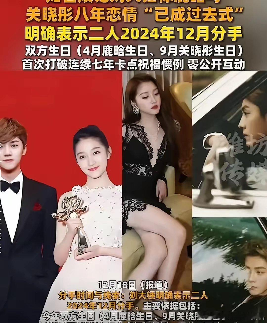 鹿晗关晓彤被狗仔刘大锤爆料去年12月就分了,理由是鹿晗不想结婚、关晓彤家生意缺钱想让他投,他没答应。七年情侣档突然散伙,热搜直接爆,阅读量飙到八亿,两边工作室到现在一句话没说。粉丝有的哭坟有的喊假,路人只想等个官宣。我看爆料视频里鹿晗一个人遛狗,关晓彤陪爸妈吃饭,同框零互动,连节日祝福都停了,基本坐实。恋爱谈成上市公司,合则双赢,散就跌停,娱乐圈感情真经不起放大镜。七年青春换一句和平分手,体面是体面,就是有点唏嘘。感情不是商业计划书,合不来就停损,至少没互撕,给彼此留点余地,也算成年人体面。