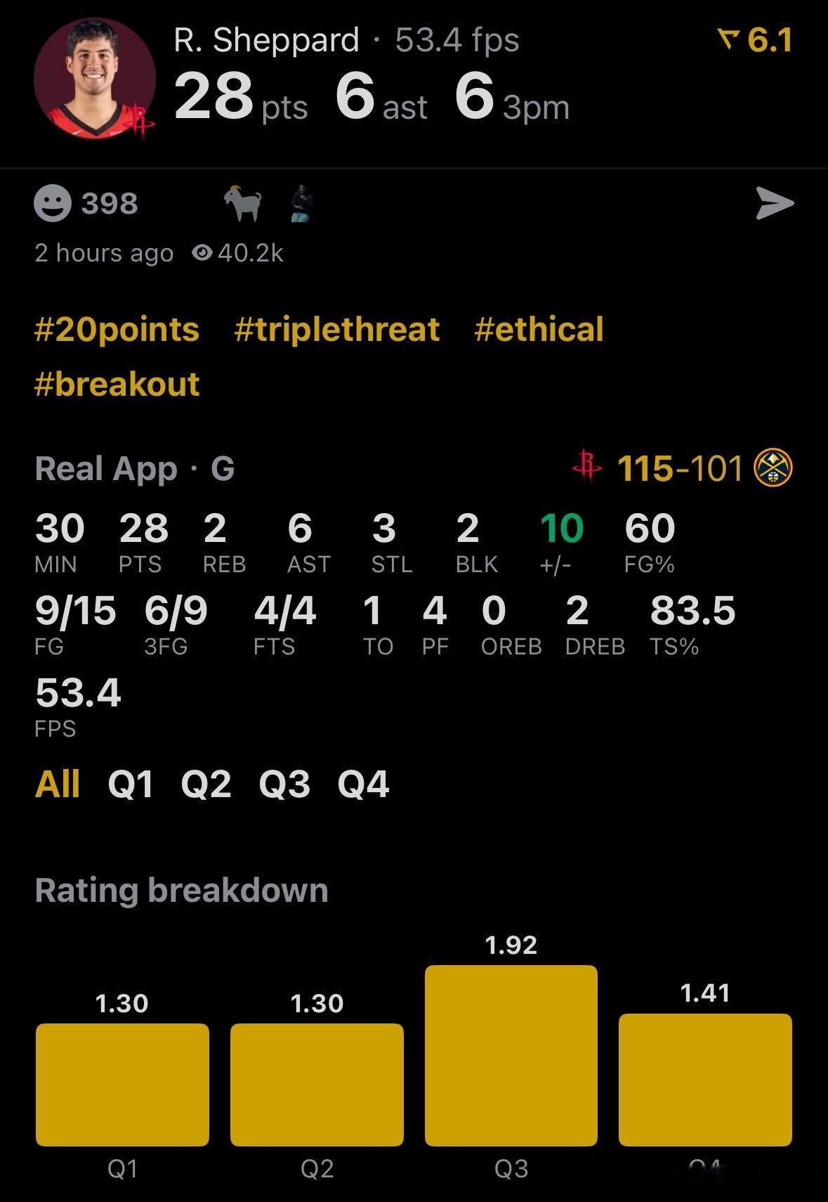 休斯顿火箭 谢泼德-我的评分:戳链接,快速直达评分现场:网页链接 谢泼德:看啥,鼓掌啊👏🏻今天小谢就不多赘述了,今天没有他,火箭不可能打得这么顺利!!!他就是掘金者,淘金人!!休斯顿火箭火箭vs掘金nba趣评分