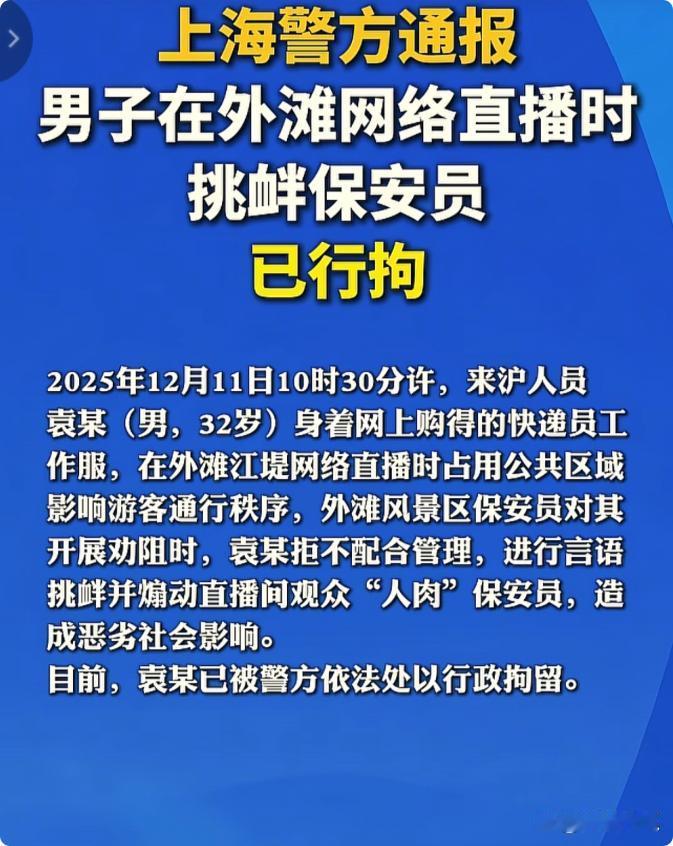 上海外滩一男子扰乱公共秩序事件近日处理完毕。32 岁男子袁某身着仿快递服在直播中占用道路,面对保安劝阻,不仅挑衅 "来打我",还煽动 1.9 万观众对保安进行网络搜索。目前该男子已被依法行政拘留,相关直播账号也已封禁。此事为直播行业再次敲响警钟:公共区域并非个人表演场所,流量更不能成为违法的挡箭牌。这种占用公共资源、煽动网络暴力的行为突破社会底线,必须依法严肃处理。平台也应加强监管,及时制止不良直播行为,避免造成恶劣影响。公共场所直播需遵守法律法规,任何煽动网络暴力的行为都将受到法律惩处。对于此类直播乱象,你有什么看法?