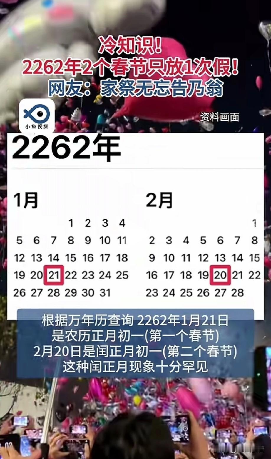 根据万年历查询得知,2262年闰一月,也就是说,要过两个春节,意味着那时的我们要有两个春节长假。兄弟姐妹们,好好的活着,加油活,争取活到2262年。 那时的中国早已经是世界强国,万邦来华。像比亚迪,华为,大疆这样的企业早已是世界头号企业,各个行业的翘楚。那时的比亚迪新能源汽车销量已遍布全球,世界第一,华为也是如此。 2262年10.1国庆是建国323年,那时候的国庆大阅兵,又有什么样的新式武器呢。最后祝祖国繁荣昌盛,国泰民安。