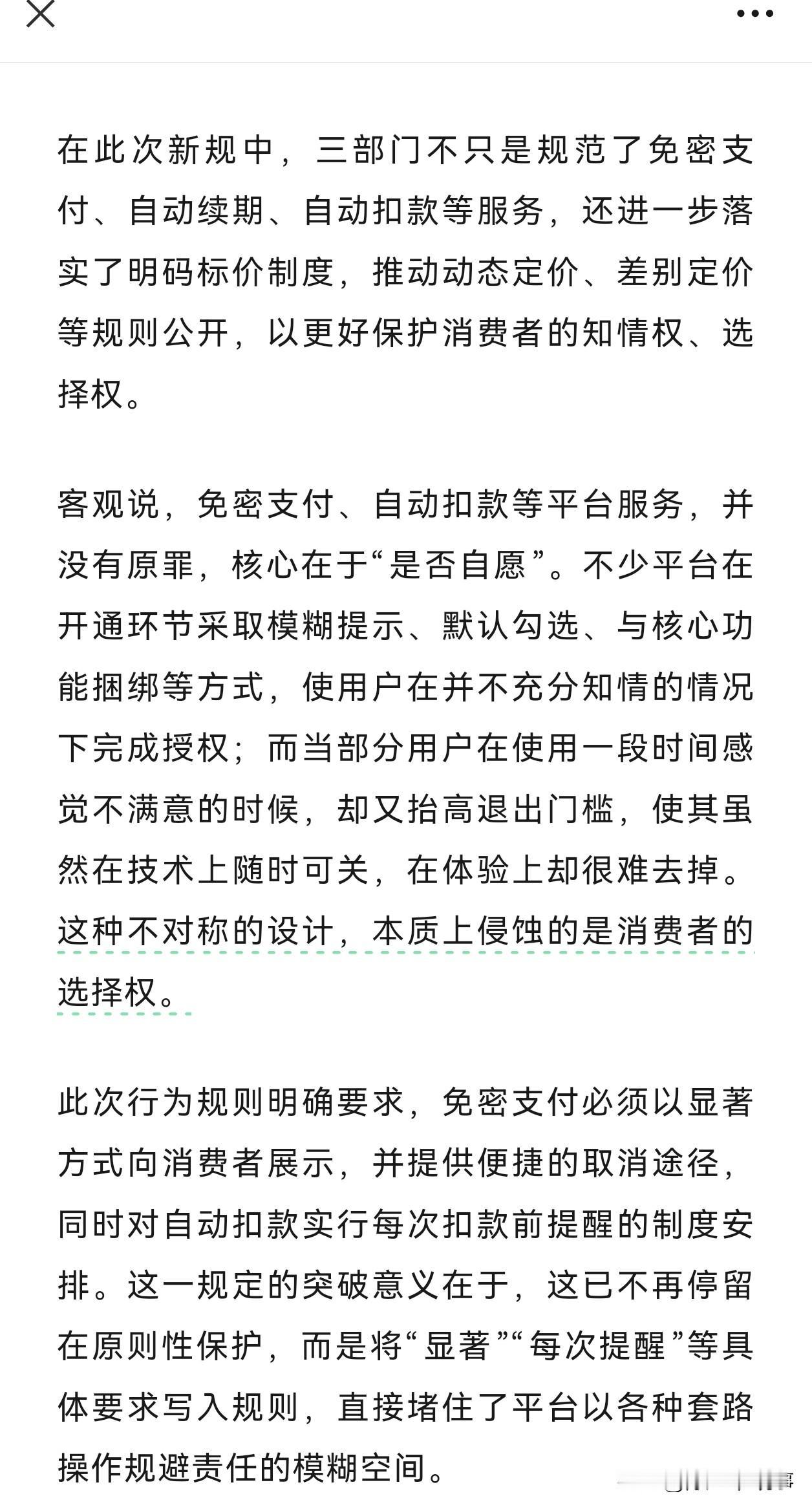 免密支付被整治了?! 我说不出是好是坏,名义上算好吧,因为我很少用,就一个音乐app。但可能对有些人是好,毕竟国家出手了。从20号起, 商家必须清楚的表明免密支付的取消位置,以及相关的,也包括通知你可以在哪里取消等。 商家嘛,确实也该整治了,商家背后是人,是人就有人品不怎么样的,老板也就不怎么样!所以大家会看到: 有些平台免密支付关闭死难,基本都偷偷摸摸自动扣款问题比比皆是! 特别是一些金融平台,特别是一些app,我之前用到过!像考古一样难找到它们那个免密支付。 大家各有体会吧… 支付宝商家扣款 移动乱扣费用 支付黑名单 终于有望破解。