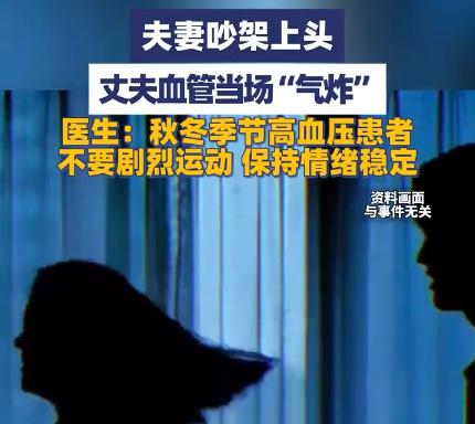 夫妻吵架上头,丈夫血管当场“气炸”! 今天必须跟大家唠唠一件特别惊险的事儿,这事儿就发生在江苏扬州的张先生身上,看完真的让人后背发凉,也给所有高血压人群敲响了警钟! 近日,张先生和妻子因琐事儿起了激烈争执,两人吵得那叫一个面红耳赤,情绪完全失控。 谁能想到,就在这一番争吵之后,张先生突然“扑通”一声倒地,紧接着就捂着胸口,满脸痛苦地喊着胸口像被撕裂了一样疼。这可把家人吓坏了,赶紧把他送到了医院。 到医院一检查,好家伙,问题大了去了! 原来张先生本身就有严重的高血压,这一吵架情绪一激动,血压就跟坐了火箭似的“蹭蹭”往上涨。 高压血流就像一股强大的力量,直接把主动脉内膜给撕开了,形成了特别凶险的“主动脉夹层”。 这主动脉可是咱们身体里最粗的血管啊,一旦破裂,那就会引发大出血,急性期的死亡率超过40%,想想都让人害怕! 好在送医及时,经过医生的全力抢救,张先生这才脱离了生命危险,病情也慢慢稳定下来。 医生提醒:秋冬季是咱们血管的“易爆期”。为啥这么说呢?秋冬天气温一降,咱们的血管就会收缩,本来就血压不太稳定的人,这时候血压就更容易波动了。而且啊,情绪波动对高血压患者来说,那危害简直太大了。就像张先生这样,一生气血压飙升,差点就丢了性命。 其实啊,除了情绪激动,高血压人群还有一些“血管杀手”动作,大家可得记好了。 比如说清晨起床的时候,千万别起得太猛。你想啊,经过一晚上的休息,身体还处于相对放松的状态,猛地一起床,血压一下子就上来了,多危险呐。还有排便的时候,也别过度用力。有些朋友便秘,一上厕所就使出浑身力气,这可不行,很容易让血压升高,引发意外。另外,搬运重物的时候也别憋气,憋气会让胸腔内压力增大,进而影响血压,对血管造成伤害。 这事儿在网上也引起了大家的热议,好多网友都感慨说:“这赢了争吵,输了命可太不值当了,还是家和万事兴,这才是咱们的保命符啊!” 确实,一家人过日子,哪有不磕磕绊绊的,遇到事儿多忍让一步,多沟通沟通,别动不动就吵架生气,毕竟身体是自己的,气坏了可没人能替咱们受罪。 医生也给出了建议,要是咱们感觉头晕目眩、心跳加速的时候,可以试试“478呼吸法”,就是先用鼻子吸气4秒,然后屏住呼吸7秒,最后用嘴呼气8秒,这样重复几次,能让咱们的情绪慢慢平静下来。 要是实在控制不住,那就赶紧离开现场,找个地方冷静冷静,等情绪平复了再回来解决问题。 最后,提醒咱们高血压患者,一定要按时服药,可千万别擅自停药。 要是突然感觉胸口有撕裂样的疼痛,别犹豫,第一时间拨打120,这可是救命的关键时刻。 家人们,咱们都把健康重视起来,平平安安的才是最大的福气,大家说是不是这个理儿? 赶紧把这篇文章转发给身边有高血压的家人朋友,让他们也提高警惕!