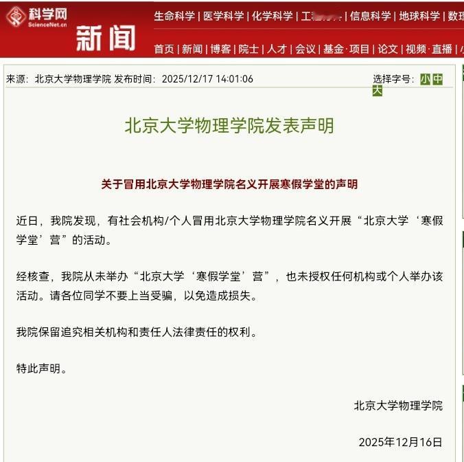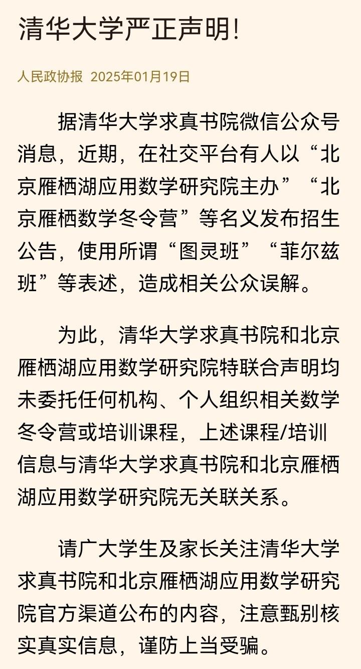北大和清华接连发布打假声明!是骗子太狡猾,还是家长太焦虑?(详见附图)。 先看北京大学物理学院,12月刚发布声明,揭穿有机构冒充他们开办所谓的“寒假学堂营”。学院明确说:从来没办过,也没授权过,大家千万别信。 无独有偶,清华大学今年也多次“中招”。先是1月份,有人打着清华大学求真书院和“北京雁栖湖应用数学研究院”的旗号,用“图灵班”“菲尔兹班”等高端名头招生办冬令营。 到了6月,更有商业机构直接冒用“清华大学经管学院院长”的名号,开展收费不菲的商业培训、总裁班。清华这次动了真格,不仅发声明,更是直接提起了诉讼,要追究法律责任。 名校招牌,成了骗子的“财富密码” 这些机构的手法如出一辙:利用家长和学生对名校的向往,伪造出与学校官方合作的假象。他们往往以“提升能力”、“拓展高端人脉”为诱饵,收取高额费用,但实际内容可能与宣传天差地别,让消费者既损失钱财,又浪费了时间。 学校方面也是苦不堪言,声誉受损,还不得不花费精力一次次出来辟谣和维权。 老话说“树大招风”,但名校的“风”是不是也太大了点? 除了提醒大家擦亮眼睛,只认官方渠道外,我在想:这种乱象屡禁不止,是否也因为违法成本太低?到底要怎么做,才能彻底铲除这些寄生在名校光环下的灰色生意呢? 这事你怎么看?你觉得屡屡被骗,是骗子太狡猾,还是家长太焦虑?