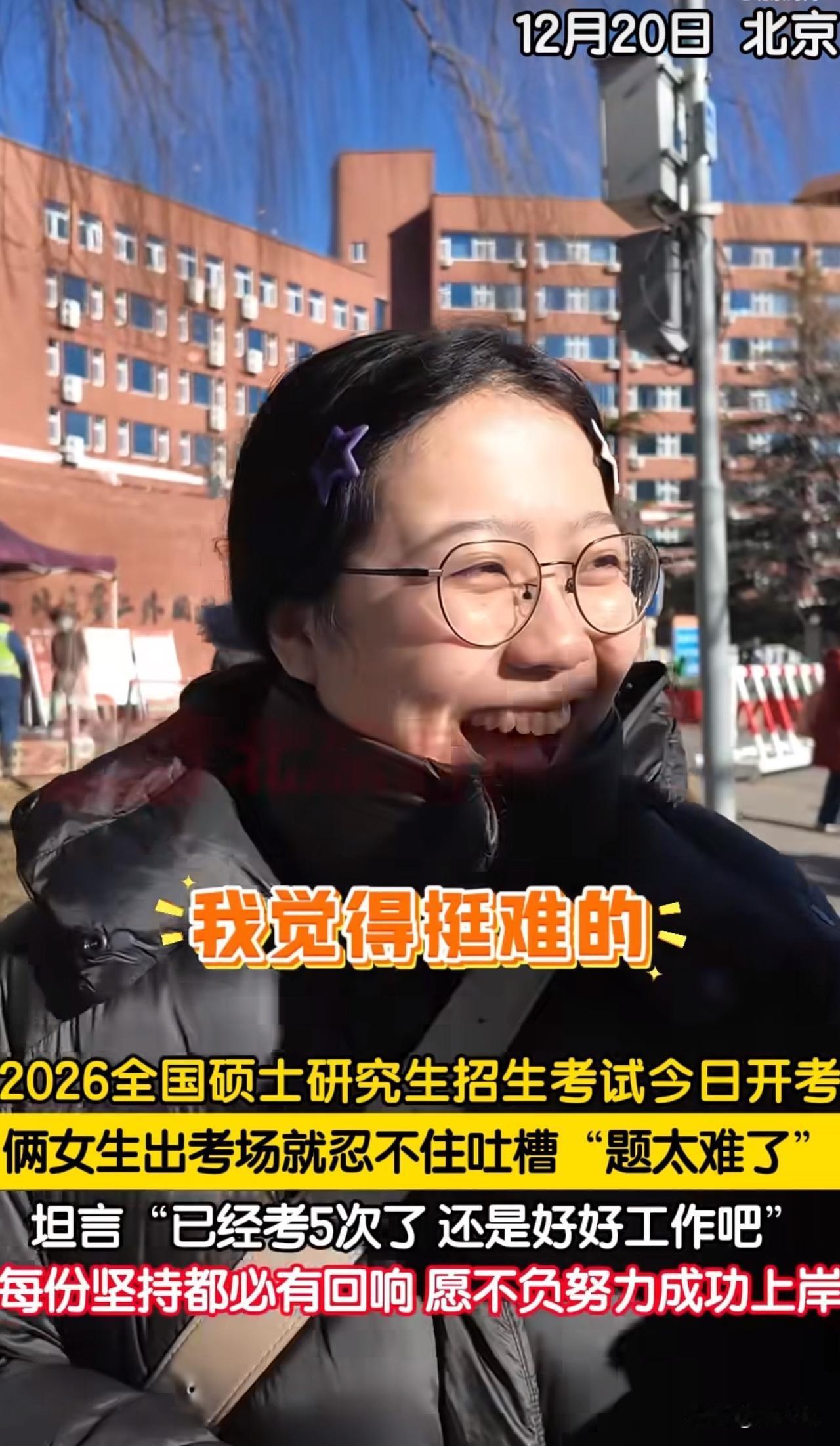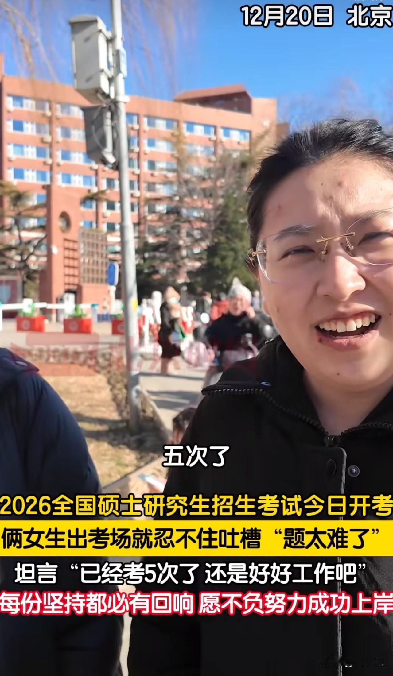 “真是好笑又心酸!”北京考场外,刚结束2026考研的一位女生对着镜头红了眼:“英语题太难了,考5次了,不考了,好好工作吧!” 简单一句话,道尽了多年备考的心酸与释然,迅速引发热议。 有网友当即表示:“不是所有坚持都有结果,懂得及时止损也是智慧,5年青春够积累很多工作经验了”! 也有网友称赞:“佩服这份毅力,但考研不该是逃避就业的避风港,找对方向更重要”! 在周少看来,考研本质是提升自我的途径,而非人生必选项。 教育的核心是成长,不是死磕一张文凭,备考中积累的学习能力、抗压能力,换个赛道同样能用。 其次,理性规划比盲目坚持更重要,若多次失利,不妨看看职场、考编、技能提升等多元选择。社会对人才的评价早已多元,实践经验、专业技能有时比学历更吃香。 总而言之,周少觉得人生不是单选题,放下“非考研不可”的执念,或许能在更适合自己的路上闪闪发光,最重要是找到属于自己的赛道。#寻美三湘# #长沙新朋友#
