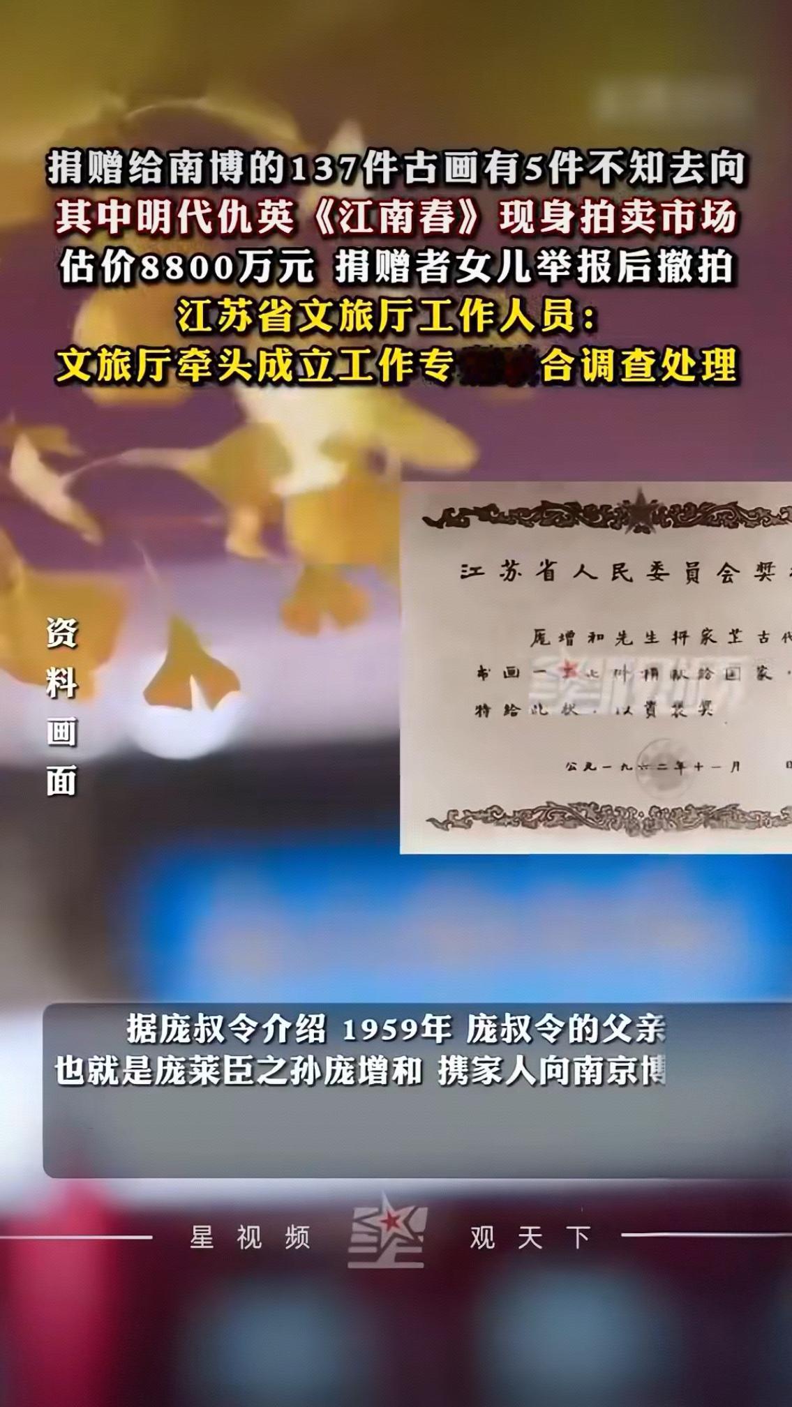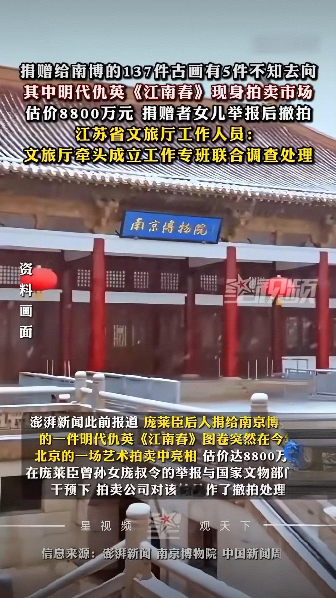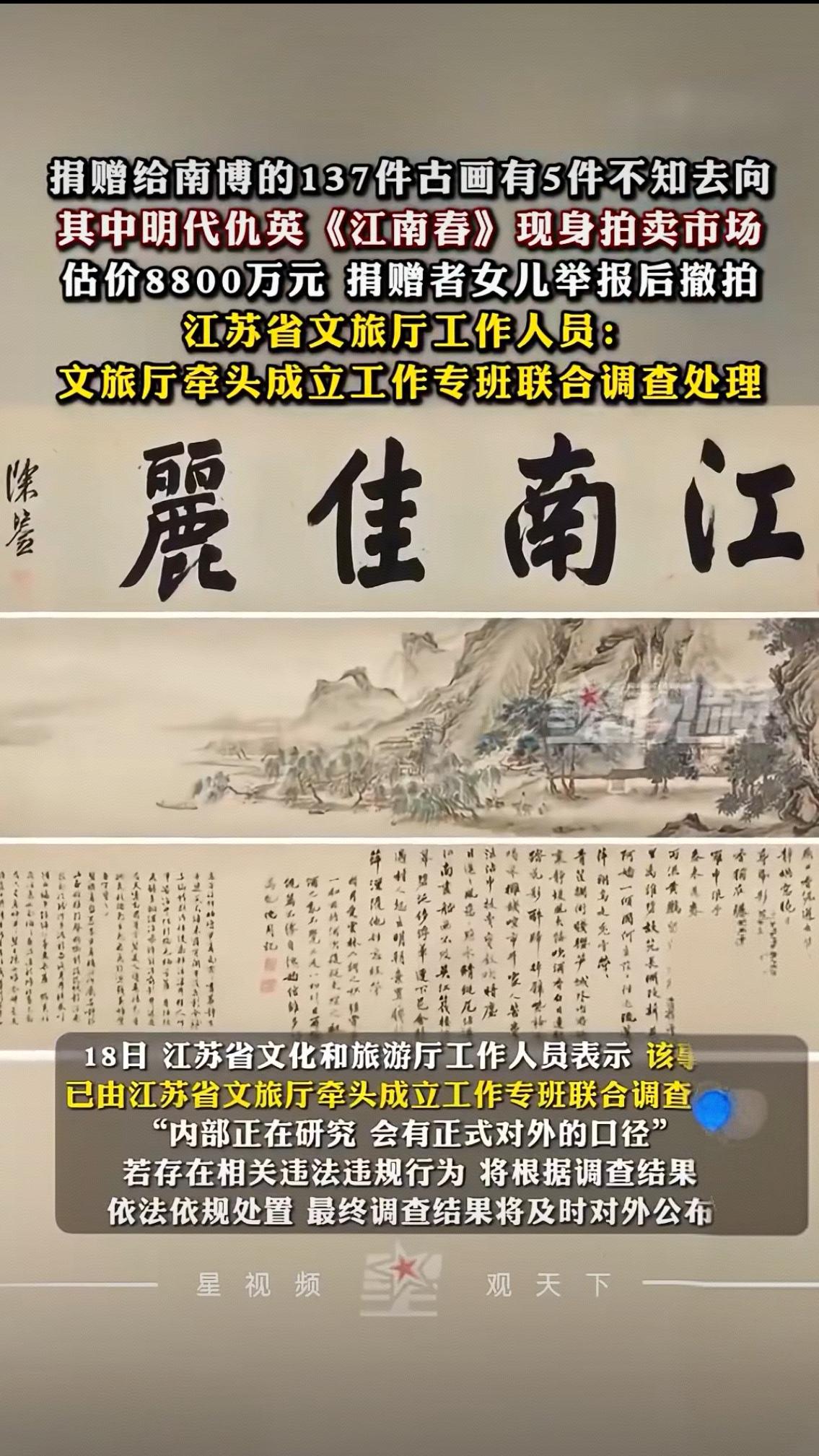 137件捐赠古画5件失踪,仇英真迹现身拍卖场:这场风波里,藏着人性最痛的体面 捐赠给博物馆的137件珍贵古画,平白无故少了5件,其中一幅明代仇英的《江南春》更是堂而皇之出现在拍卖市场,估价高达8800万元。 消息一出,全网哗然。捐赠者女儿一纸举报,才让这幅本该静静躺在博物馆展柜里的国宝,紧急撤拍。 所有人都在追问:好好的捐赠文物,怎么就流到了拍卖市场?那些“不知去向”的古画,到底藏着多少不为人知的猫腻? 这起事件的核心,从来不是一幅画的价值,而是一场关于“信任”与“背叛”的人性拉扯。捐赠者当初倾囊相授,是怀着对文化传承的赤诚,相信博物馆能给这些古画一个安稳的“家”;可如今,文物莫名失踪、现身拍卖,寒的何止是捐赠者家人的心,更是无数愿意为文化公益伸出援手的普通人的热情。 有人说,文物是无声的历史,可在这场风波里,这些沉默的古画,却成了人性的“照妖镜”。它照出了某些人面对巨额利益时的贪婪与侥幸,也照出了文物保护链条上可能存在的漏洞与疏忽。 万幸的是,捐赠者女儿没有选择沉默,江苏省文旅厅也迅速成立专班介入调查。那句“若存在违法违规行为将依法依规处置”,让我们看到了公道的曙光。 文物从来不是某个人的私产,它是民族的记忆,是历史的传承。这场风波,终会有一个水落石出的答案。而我们更该期待的是,调查结果不仅能找回失踪的文物,更能堵住漏洞,让每一份赤诚的捐赠,都能被温柔以待。 评论区聊聊:你觉得失踪的文物该如何追责?那些打着“保护”旗号的蛀虫,该不该被严惩到底?仇英作品价格 江南百景园仇英