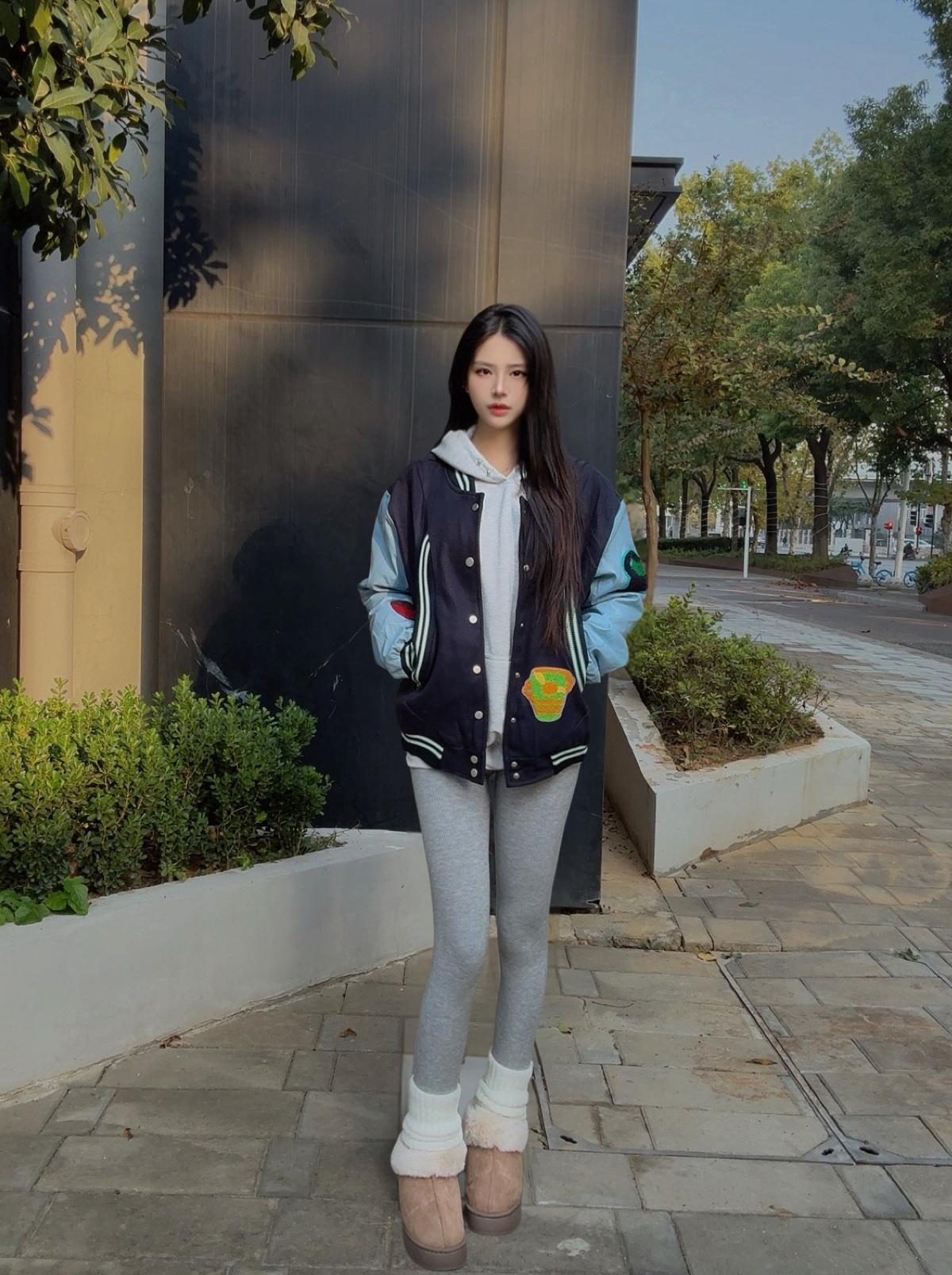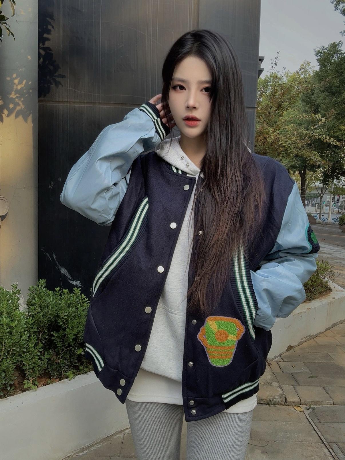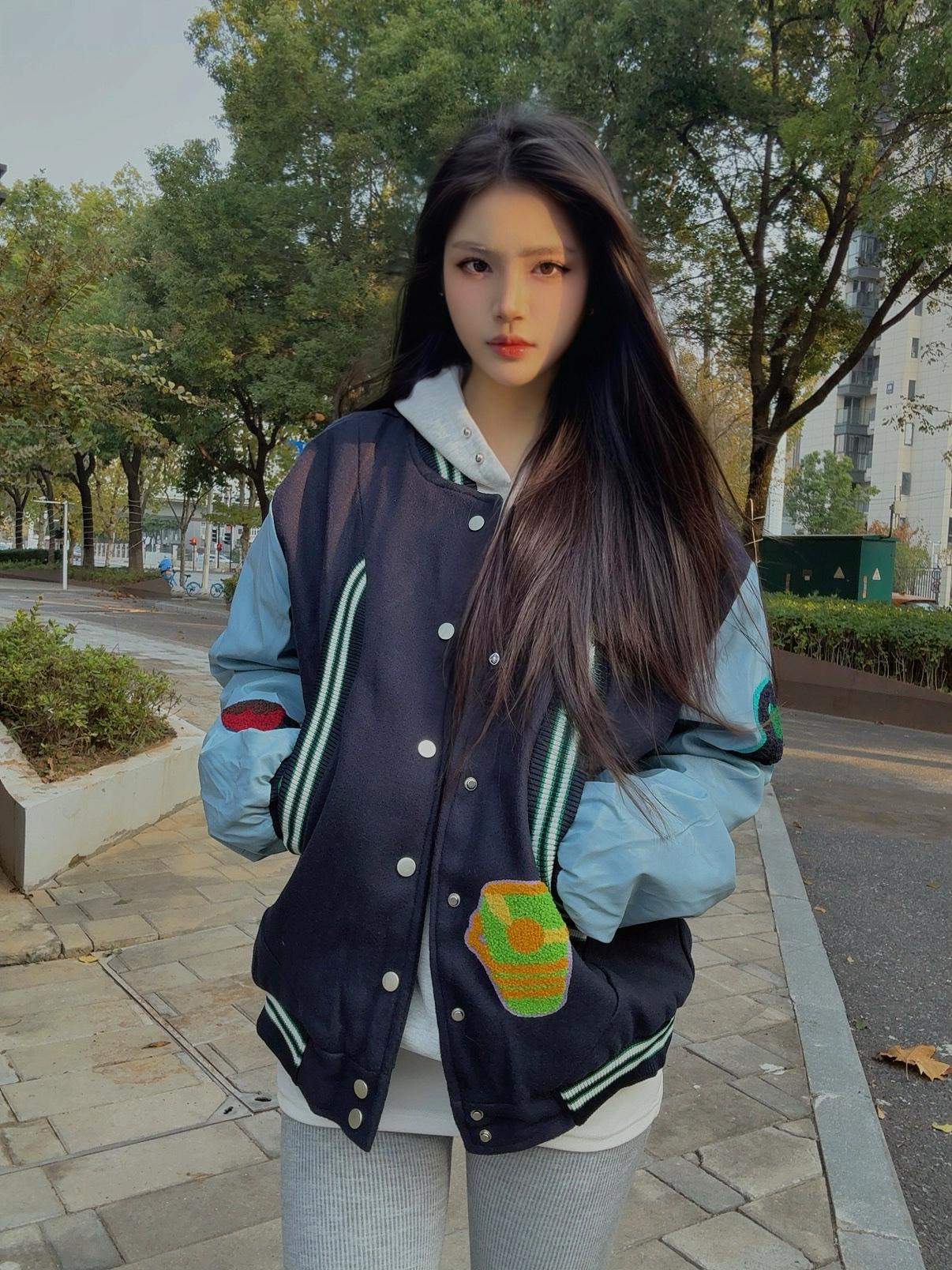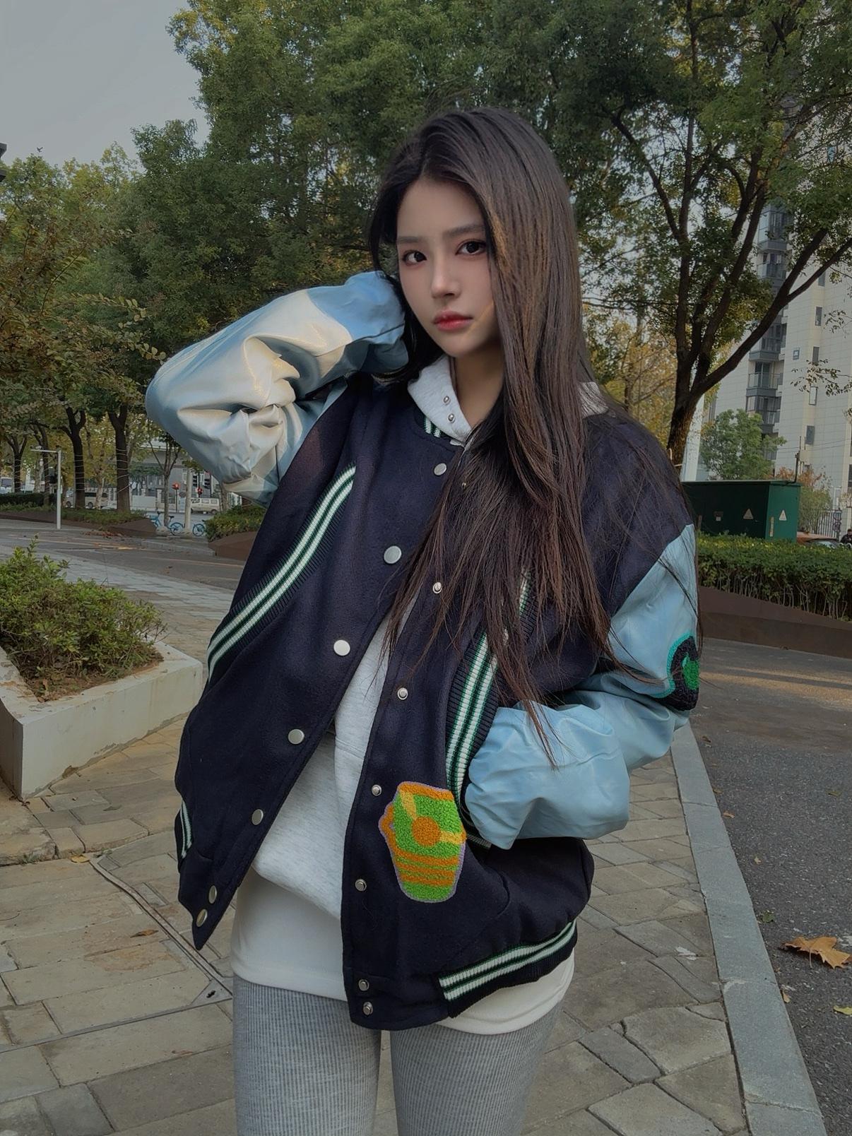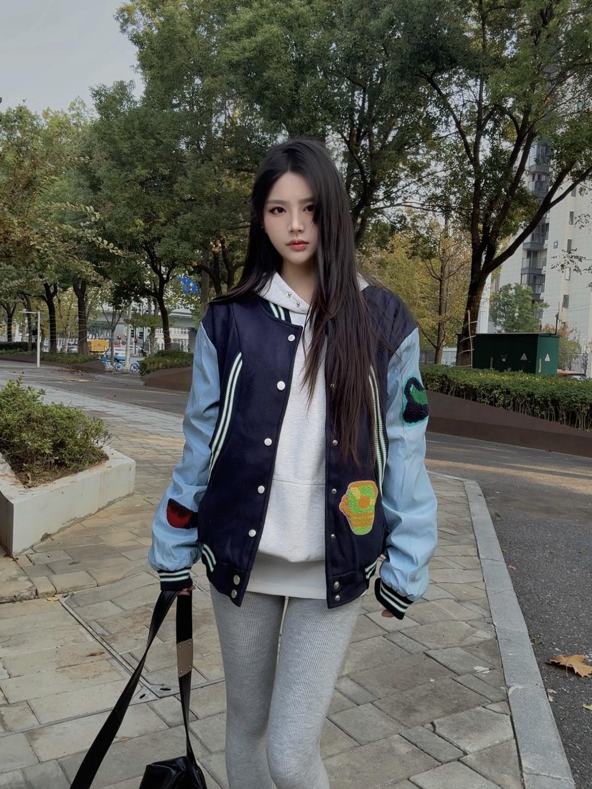 复古与潮酷的碰撞,这件棒球服绝了! 藏蓝拼接浅蓝的撞色设计,自带美式复古滤镜,袖子上的趣味贴布绣又添了几分街头潮酷感~内搭浅灰连帽卫衣,下身搭配灰色坑条打底裤,休闲随性还很显比例,再拎个黑色腋下包,日常出街吸睛度拉满,是又飒又美的校园风女孩没错了~咖色棒球服搭配 复古撞色棒球服 绿色棒球服搭配 秋冬拼接棒球服